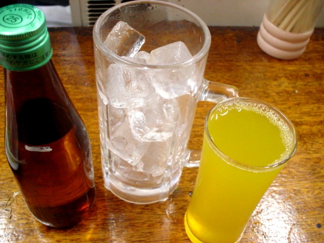 さて、ビールを飲み終えたところで、いよいよ、本日のメイン「ウコン割り」に移ろうかな。ブログのコメントで「キンミヤさん」から教えてもらったのだ。「焼酎(いいちこ1合半550円)とウコン茶(200cc 200円)ね。」とカウンターの中のお兄さんに声をかける。実はウコン茶自体飲んだことがないのだ・・・どんな味?