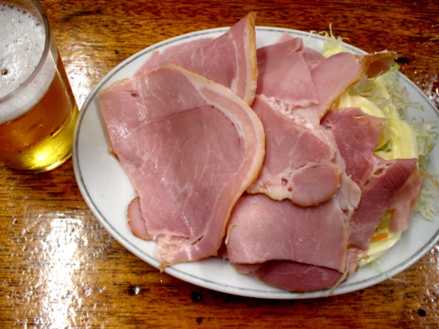 「ハムとキャベツ」が届く。来たー。すごいボリュームだなあ。厚切りのハムが10枚以上はのってるんじゃないかなあ。マヨネーズがかかったキャベツを挟んで・・・がぶりと豪快に・・・むぉ〜、これはいいぞ〜。ハムがまた塩加減がよくて・・・うま〜い。ビール、ビール。