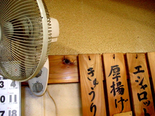 左隣のお客さんは1人客。「ハモの煮付け(350円)」と「鳥のから揚げ(350円)」を前にビールを飲んでいる。ハモは煮汁がよく滲みていて美味しいそう。もくもくとハモを食べ終わったおじさんは、「鳥のから揚げ」のレモンを取り上げ絞り始める。・・・こ、こら、レモンの汁がこっちに飛んできたぞ。もう「拭き拭き」はたくさんだからな。最後のひと絞りで自分自身の顔に飛ばしたらしく、目をパチパチさせてる・・・ふふふ。