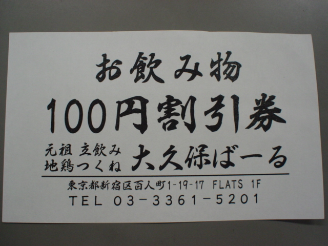 さて、こうしてのんびりしているわけにもいかない。阿佐ヶ谷に行かなければ。店の雰囲気が気持ちをゆったりさせてくれた。それで満足だ。「ごちそうさま。」お店の女性に声をかけて会計をしてもらう。「1450円です。」お釣と一緒に割引券をもらう。「新宿ばーる」でもらった券とよく似ているぞ。