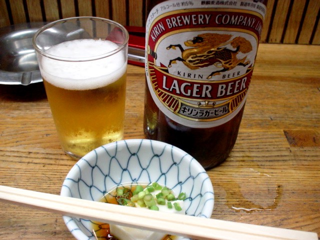 マスターがすっと近づいてくる。このタイミングが素晴らしい。「ビール(大630円)お願いします。」この店では大声を出して店の人を呼ぶということがない。いつも程よい時に、程よい位置に立ってくれているのだ。それに、お客さんも静かに飲んでいる人が多く、自然な声で全てが進んでいく。大人の酒場なのだ。ビールとお通しの冷奴が届く。ビールをグラスに注いで一口・・・冷えたビールが心地よい。