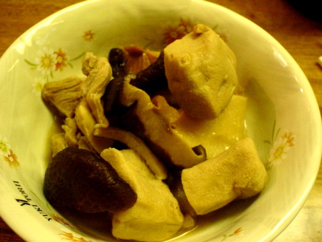 煮物が届く。おお、鶏肉や椎茸も入っている。さて、一口・・・まず、高野豆腐から・・・ほっほー、そんなに甘くない上品な味だ・・・出汁がよく効いている・・・その煮汁がよぉ〜く滲みている〜・・・美味しい!ビール、ビール。竹の子も・・・一口・・・しゃきっとした歯ごたえ・・・ふ〜む、噛むといい香りが口の中に広がるぞ〜・・・これもいい!ビ〜〜〜ル!