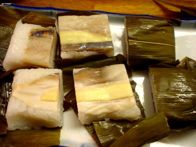 さて、なれ寿司だな。「なれ寿司、食べたことないんですよ。癖があるような気がして・・・。」「うちのなれ寿司は現代風にアレンジしたものなので、癖はあまりないんですよ。」・・・この店のなれ寿司は、柔らかめに炊いたご飯に酢を混ぜて、その上に魚をのせ笹の葉で包む。それを箱に入れて何時間か押す。それを5日間くらいまで熟成させるのだそうだ。3日目くらいを好む人が多いらしい。・・・「じゃあ、鯖(300円)とあじ(350円)のなれ寿司をお願いします。」「はい、今日は3日目ですから、美味しいですよ。」楽しみ、楽しみ。