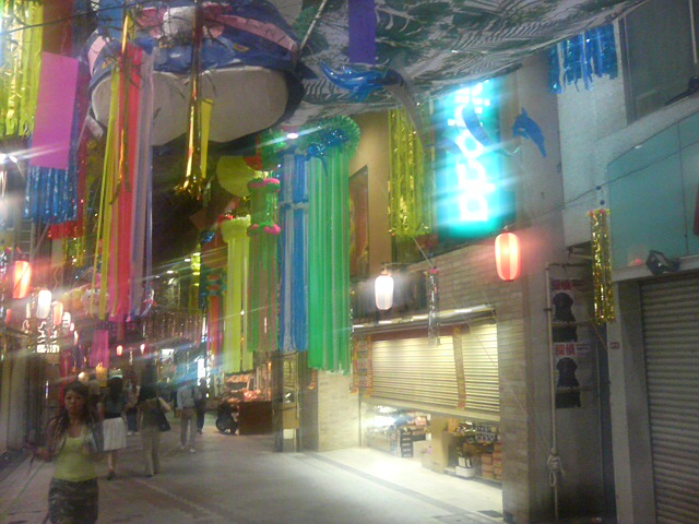 迷いながら、パールセンター商店街に入る。アーケードは明日からの「七夕祭り」を前に、華やかな飾りつけが出来上がっている。店ごとに大きな張りぼてが吊り上げられ、準備万端というところだろうか。その飾り付けが風に揺れる中、この時間でもまだまだ人通りは多い。今こそ夏本番。人々の顔も明るい。