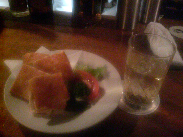 何かつまみを・・・「グリルドサンドをお願いします。」と注文する。左隣の男性は角の水割りに移っている。ペースが上がってきたようだ。入り口側の2人客はどちらも50代後半だろうか。片方の男性が恐妻家らしく、奥様の話で盛り上がっている。「よく虎の夢を見るんですよ。」「ほー、めずらしいですね。」「その出てきた虎に襲われるんですよね。」「ふむふむ。」「だからね。蹴るんですよ。その虎の頭をね。」「なるほど。」「するとね、女房が眼を覚まして、怒るんですよ。なぜ、いつも私を蹴るのって。」「ははは。」・・・ぷっ。