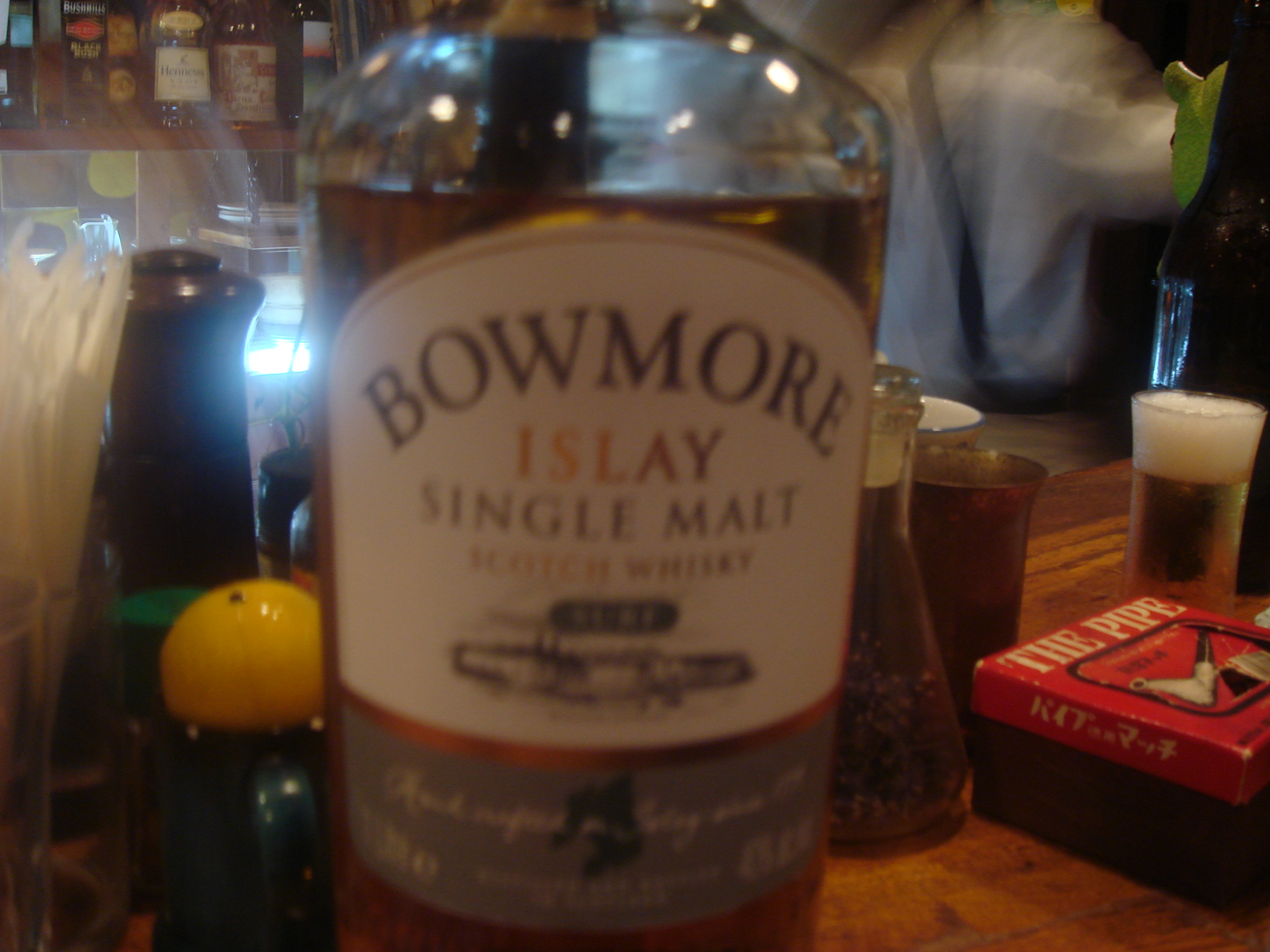 奥の席に座ると、自分のボトルが出てくる。あまりに久しぶりなので、瓶に白いマーカーで書いた名前が消えかかっている。ボウモア(サーフ)だ。・・・ずいぶん待たせたな、元気だったかい?