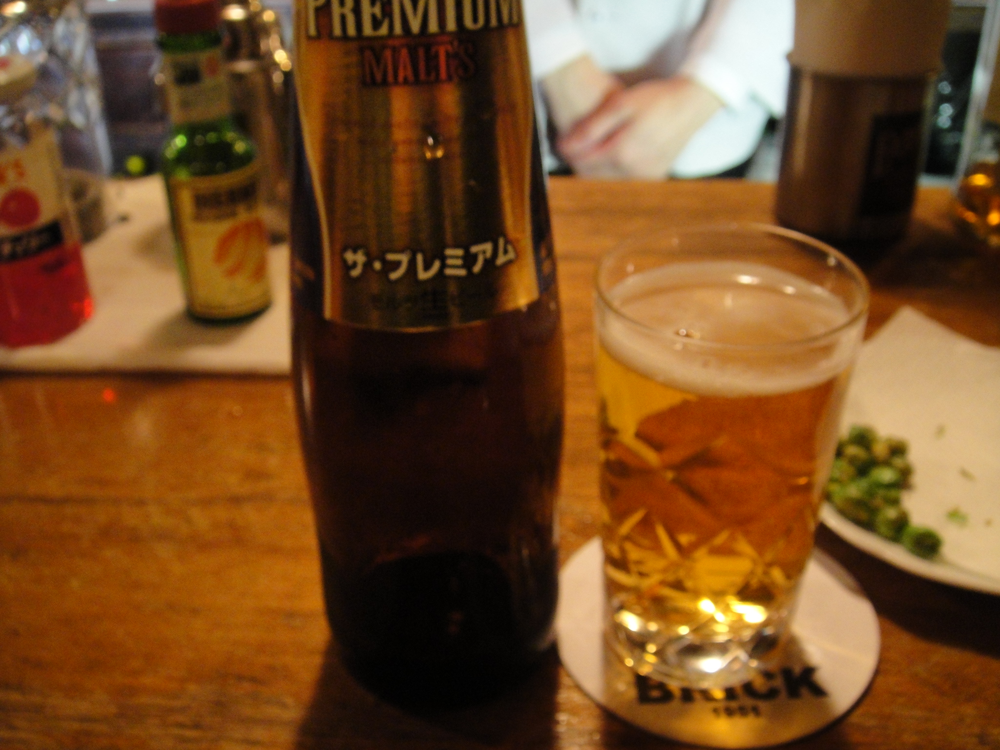 「いらっしゃいませ。」と正面のバーテンダーさんが、おしぼりを渡してくれる。バーテンダー4人に対して客1人という状態。「瓶モルツを。」と注文する。店は当然静かで、BGMのジャズが微かに聞き取れるほど。グラスが用意され、1杯目はバーテンダーさんが注いでくれる。すっとコースターに乗せたグラスを自分の方へ滑らせてくれる。