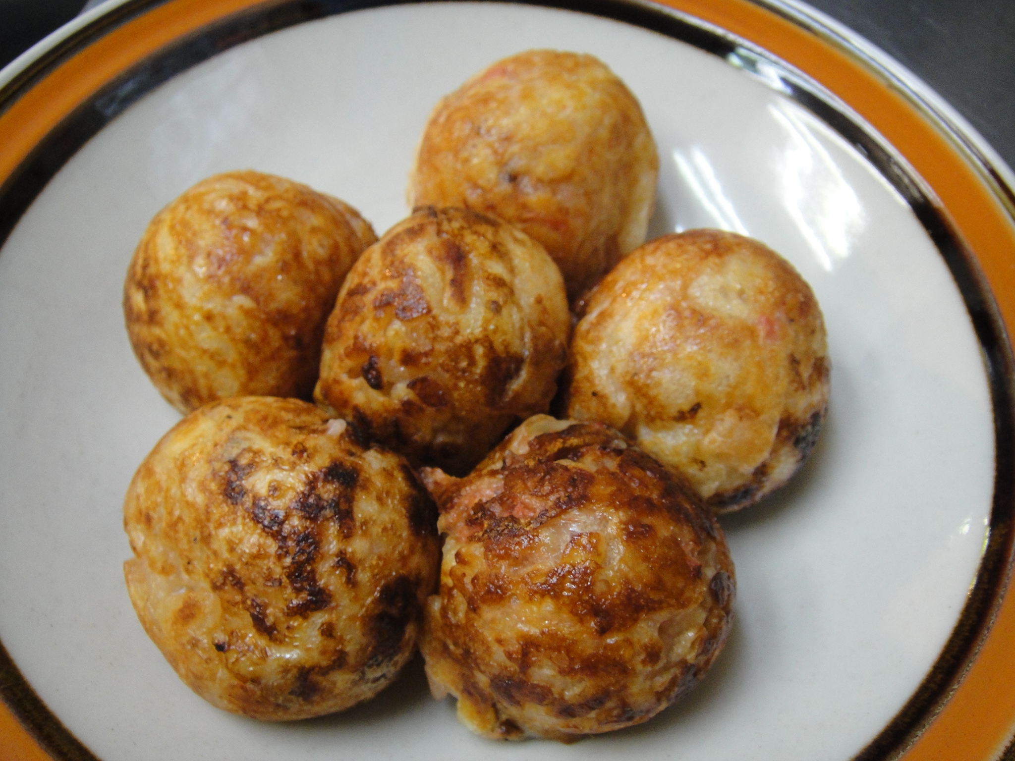 持ち帰りのお客さんが帰る。「たこ焼きは、ソースはどうする?」「素焼きのままでいいです。」皿に入れて渡してくれる。6個入っているぞ。さて、一口・・・熱つつつ・・・さすが焼きたて・・・やっぱりこの味!外側1ミリがカリッとして、中身がとろ〜り、大きめのタコが柔らかくて・・・海老の風味が最高だ!美味しい!ビール、ビール!