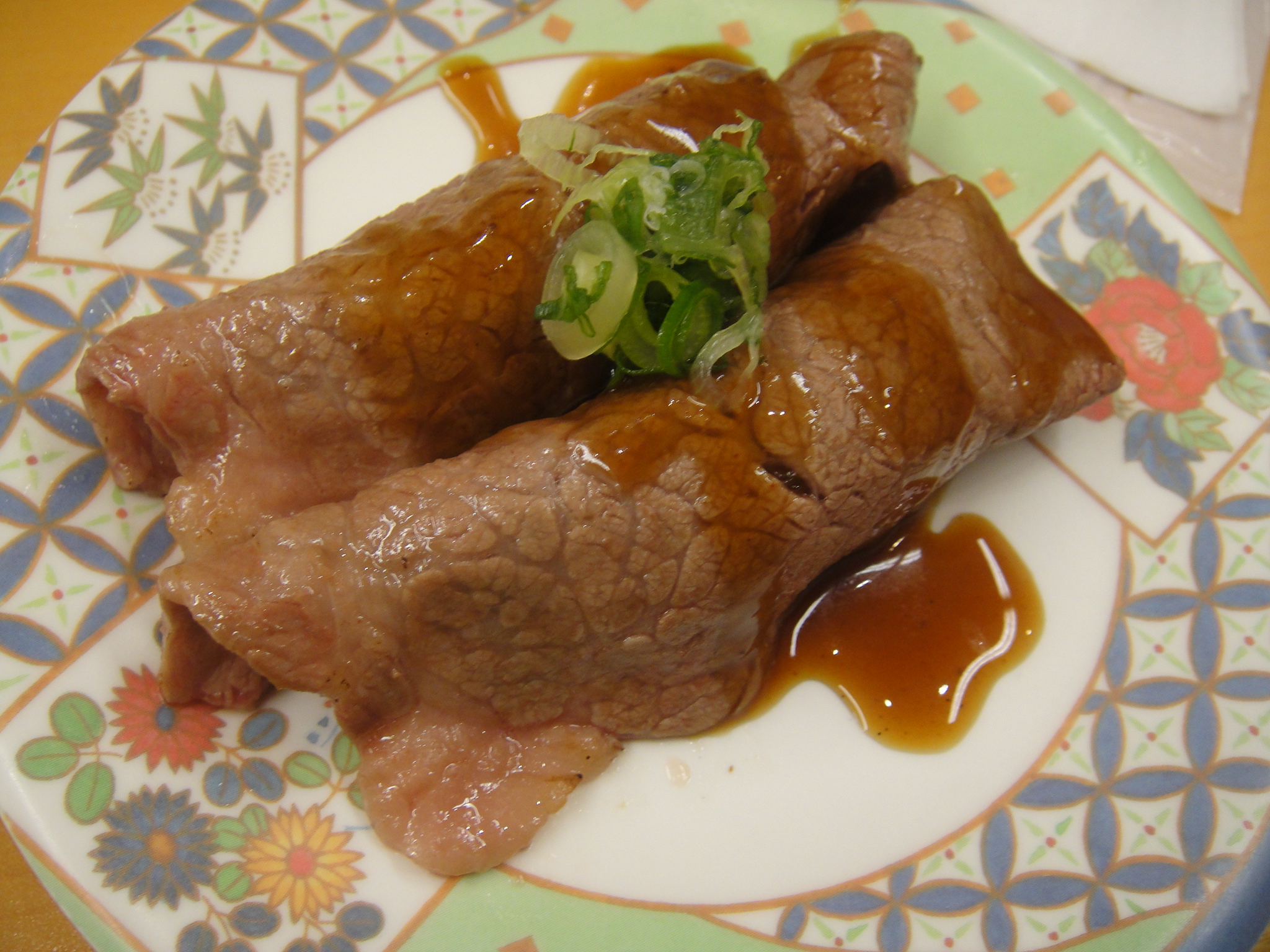 お正月ということで、さよりや小鰯はないようだったので、ちょっと変り種で・・・「牛カルビ(210円)と食べてみようかな。」「はい!」・・・カルビ肉をバーナーで炙ってくれる。それを丁寧に握って、「はい!お待ち!」・・・一口、肉が柔らか〜い・・・炙ってあるので温かいのもいい・・・脂も程よくて・・・美味しい!