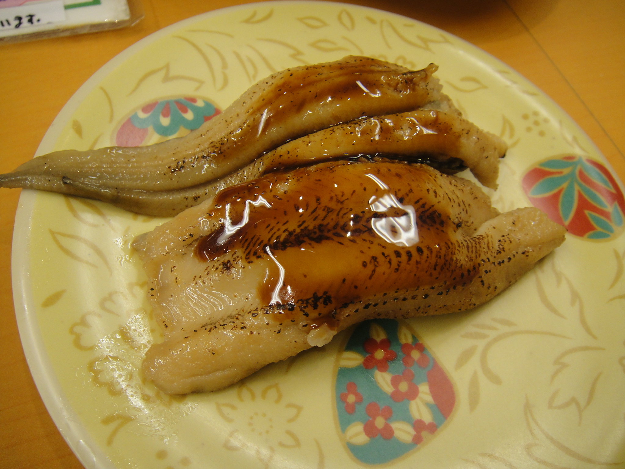 「煮あなご(263円)を。」と注文する。「はい!煮あなご一丁!」・・・ビールを一口飲んで待つ。「煮あなご」が届く。シャリは小さめでネタは大きい。では、一口・・・とろける〜、おひしひよ〜・・・美味しい!甘いタレもくどくなくていい!ビール、ビール!ふい〜。「次、何行きましょう?」「はまち(210円)!」「はい!」・・・「はまち」が届く。一口・・・身が締まってる〜、こりっとした感じかたまらん!美味しい!ビール、ビール。はふ〜。「次、何にしましょう?」・・・。