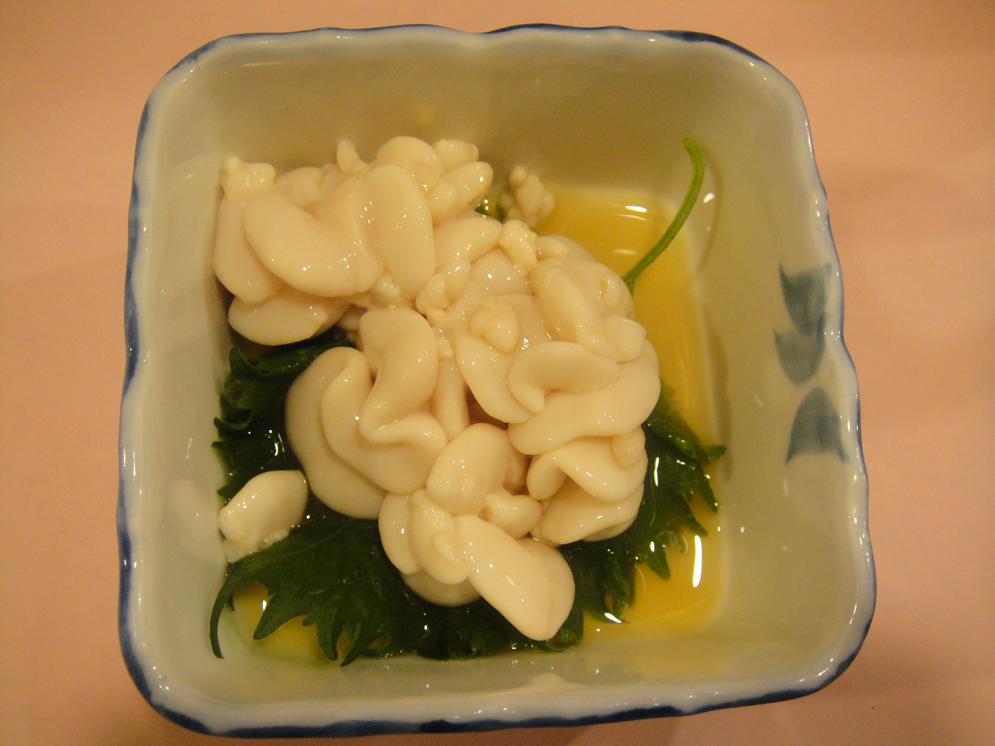・・・なんてことを思い出しながら、ビールを飲んでいると「白子酢」が届く。つやつやのきれいな白子だ。よく、血管が張り巡らされているようなのがあるが、それはちょっと嫌だ。一口・・・う〜ん、このねっとり感、いいねえ・・・酢の酸味がきつくないのでさっぱりと食べられるし、白子の風味も生かされている。美味しい。ビール、ビール!