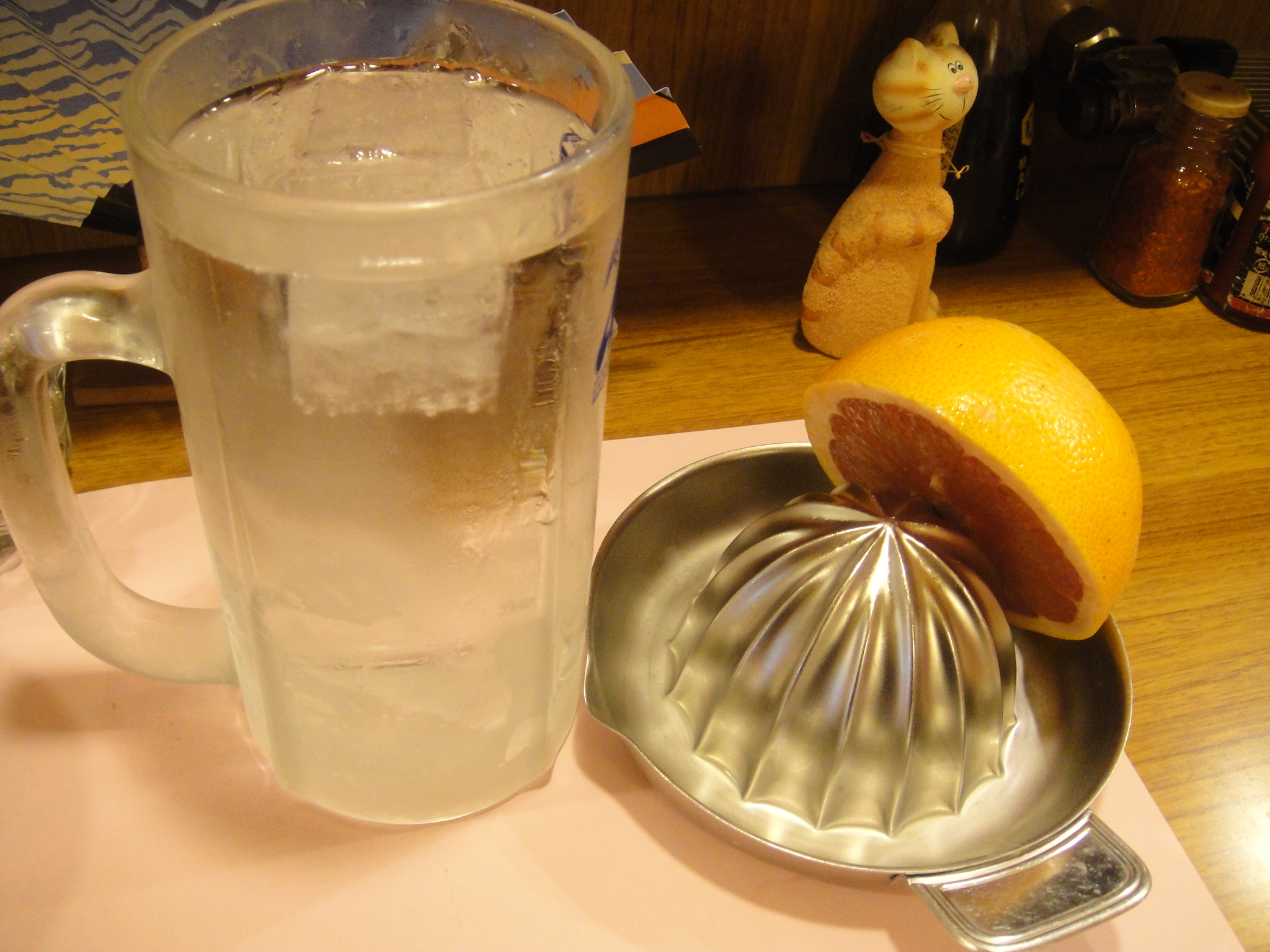 生グレープフルーツサワーが届く。絞り器で半分に切られたグレープフルーツをぐりぐりする。ジュースがだんだんたまってくる。絞り残しがないか、時々、グレープフルーツをひっくり返して確かめる。もうこれ以上絞れないなというところで、ジョッキに投入。炭酸割り焼酎の表面から、じわっと下にジュースが降りていき、混ざったかなと思ったところで、一口・・・うん、スッキリとして美味しい。果汁を使ってるから健康にいいような気がするし・・・自分に言い聞かせる。