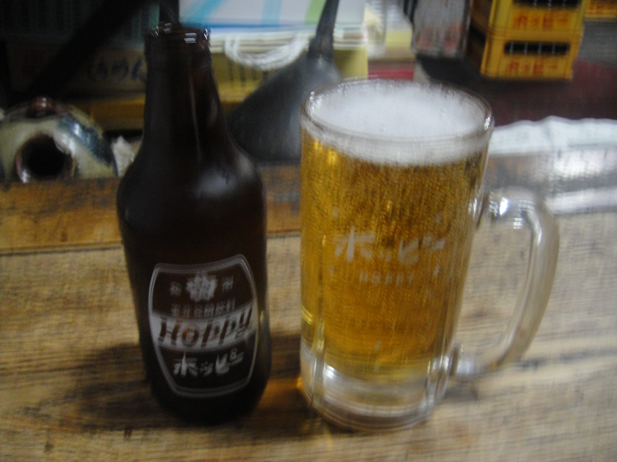まずジョッキをカウンターの上において、ペットボトルに入っている焼酎を小さめのコップに入れる。そしてコップからジョッキに焼酎を移す。これで焼酎の量を一定にするわけだ。そして、冷蔵庫からホッピーを取り出し、栓抜きでポンと詮を抜き、カウンターに届けてくれる。「はい、どうぞ。」「どうも。」ホッピーは自分でジョッキに注ぐ。瓶一本分ホッピーを注ぎきると、ちょうどジョッキが満杯になる。氷は入っていない。では、一口・・・氷が入っていない分、そんなに冷えていないのだが、却って柔らかい飲み口だ・・・ホッピーの味がよく分かる・・・美味しい!