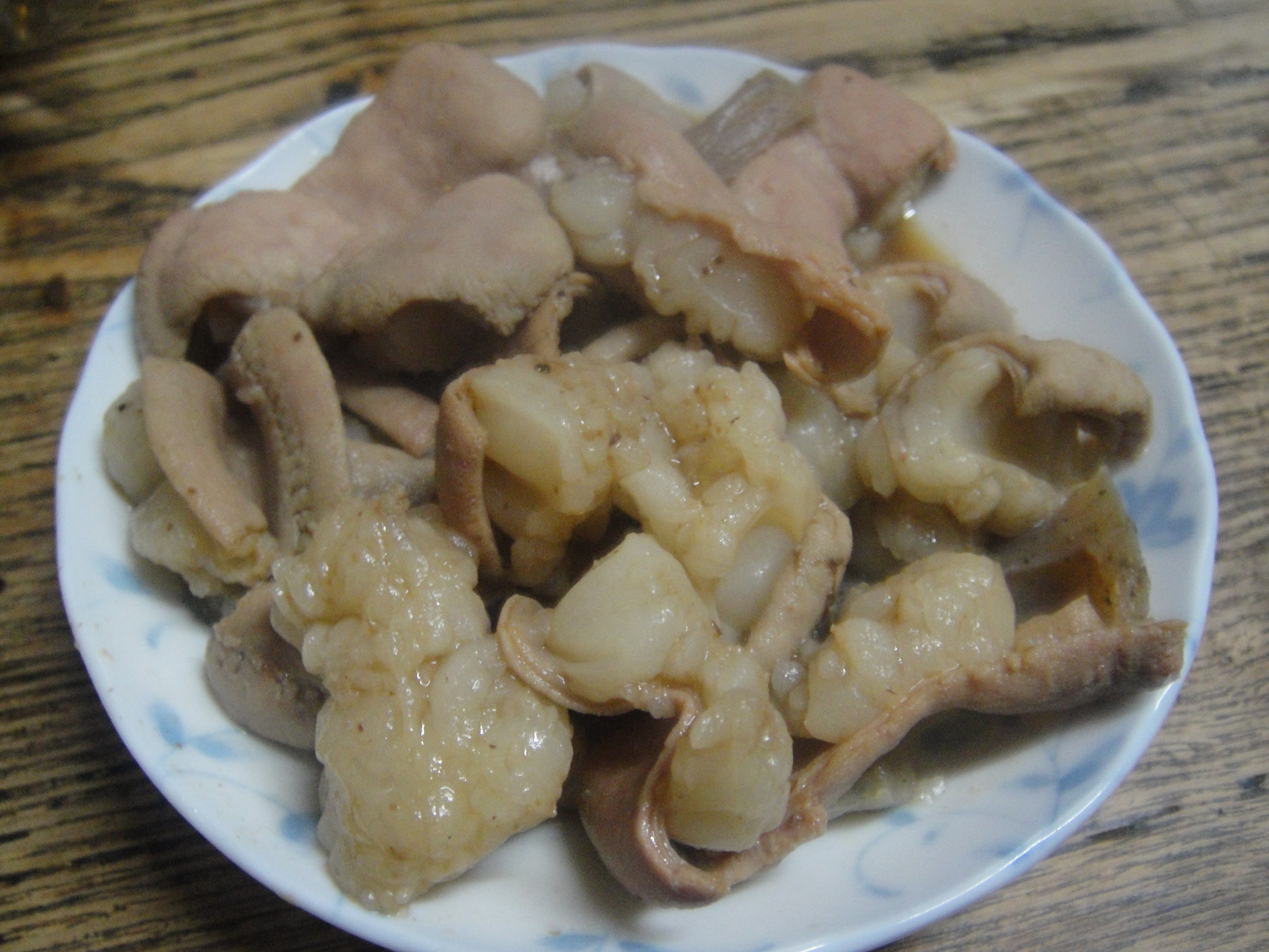 「真寿美さん、煮込み(300円)お願いします。」「煮込みね。はい。」・・・真澄さんが鍋を開けて、よく掻き混ぜてから、皿に盛ってくれる。「はい、煮込み。」「どうも。」・・・ほとんどがプリプリのもつで、こんにゃくが少しだけ入っている。独特の煮込みだ。では、一口・・・もつの脂の部分がとても甘い・・・よく煮込まれていて味がしっかり沁みている・・・なるほどホッピーの淡白な味によく合う味だ・・・美味しい!ホッピー、ホッピー!