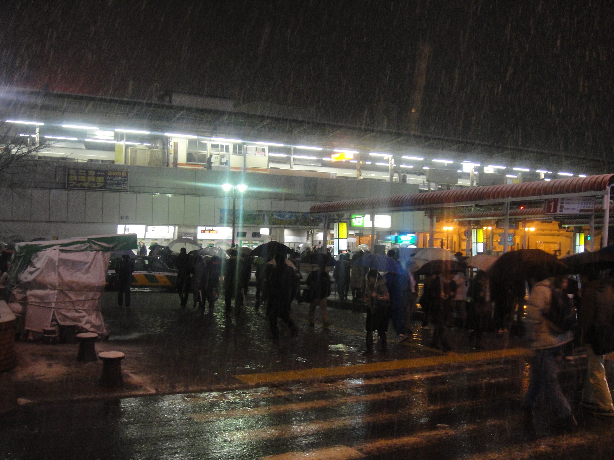 ウイスキーを3杯飲んで、席を立つことにする。「ごちそうさまでした。」「ありがとうございました。どうぞお気をつけて。」・・・外に出る。顔に大粒の雪が降りかかる。慌てて傘を開く。駅に向かう人々と一緒に駅前ロータリまで急ぐ。