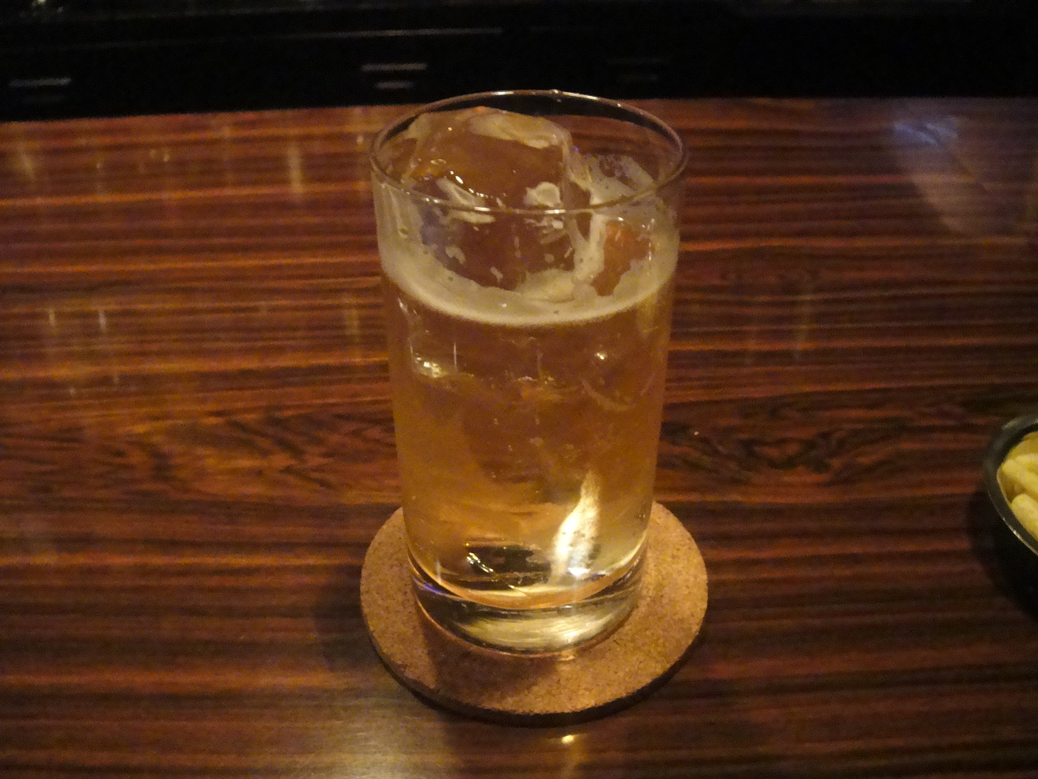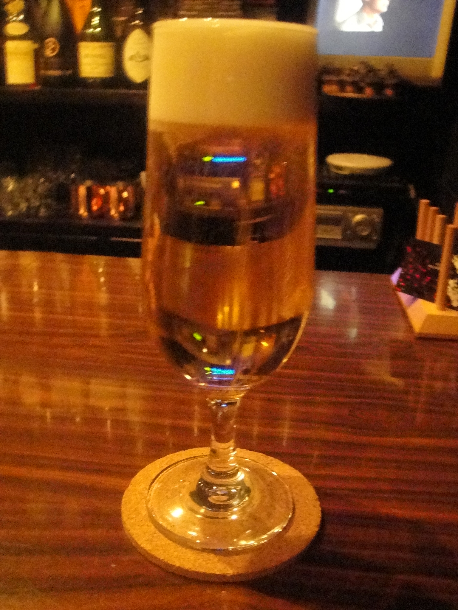 「生ビールをお願いします。」「かしこまりました。少々お待ちください。」・・・マスターはまず隣のお客さんのショートカクテルを作り始める。ビールを待つ間、棚のボトルを眺める。入口側にはシングルモルトウイスキー、その次にブレンディッドウイスキーとアイリッシュウイスキー。真ん中当たりにリキュール類。奥の棚、つまり自分の正面辺りがバーボン。