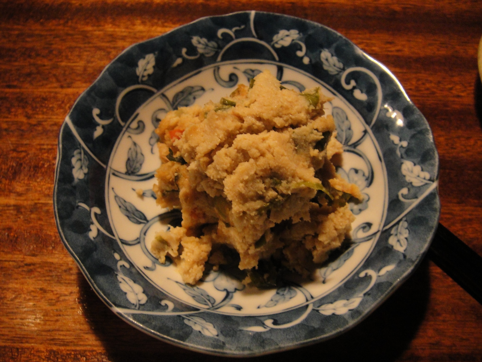「おから」が届く。一口・・・予想通りの素朴な味。ほのかな甘味がいい。これはなかなか美味しい・・・焼酎、焼酎。いいなあ〜。焼酎2杯では終われそうもないなあ〜。外は寒いし、もう少し温まっていくかな。・・・「すみません。麦のお湯割り、おかわりお願いします!」