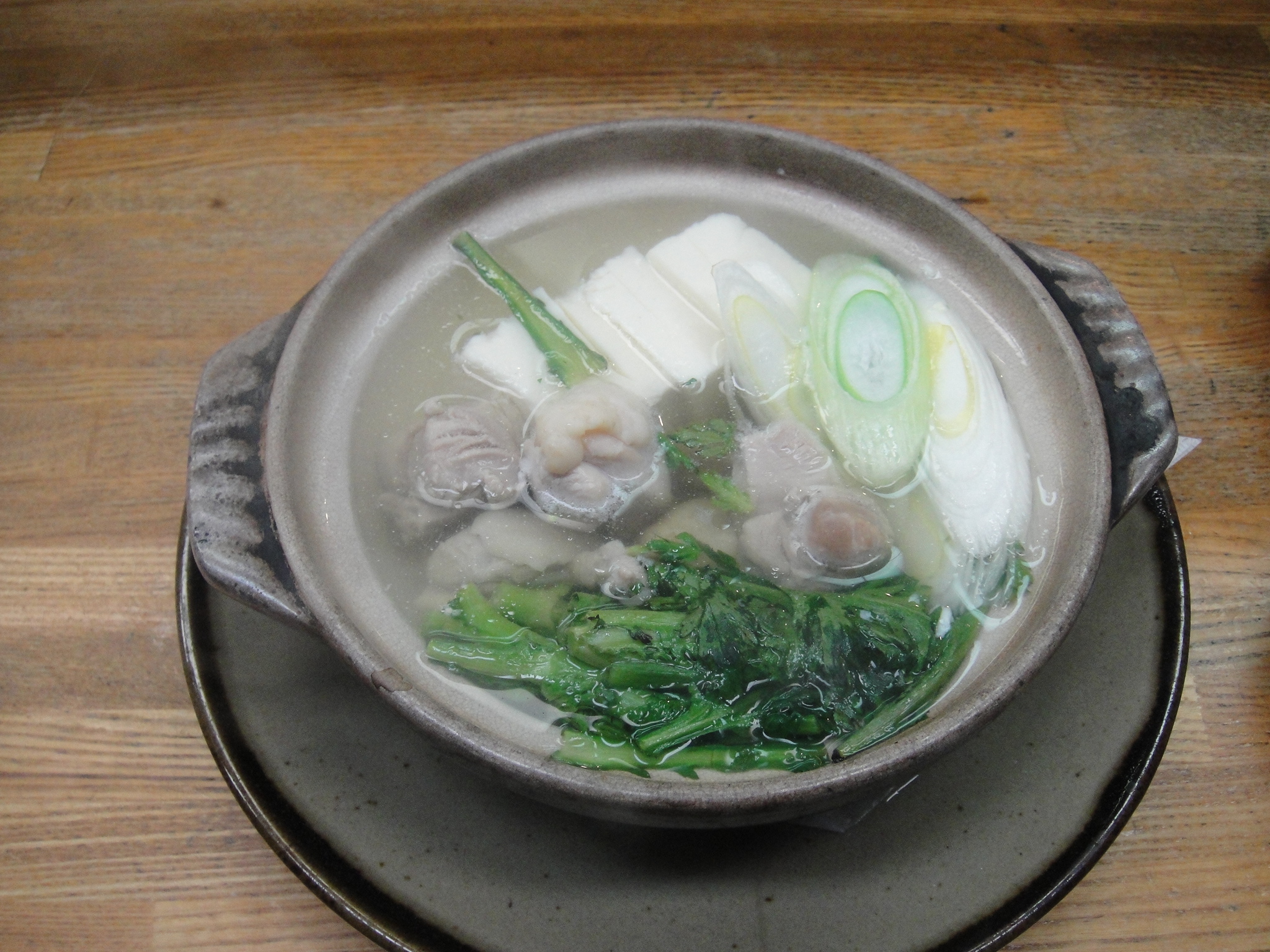「鳥鍋」が届く。鶏肉と豆腐を、出汁の効いたスープで煮る「小鍋立て」。鶏肉を一口・・・ぷりっとした肉と脂身が口の中で混じって、旨味と甘味のバランスをとってくれる。スープがまた美味しい。透明感のある薄味のスープながら、出汁がしっかり効いていて鶏肉の旨味を引き出している。これは美味しい。燗酒、燗酒!