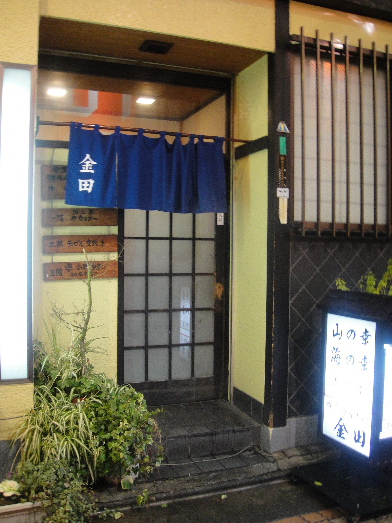 一駅電車に乗ると「自由が丘駅」に到着。階段を下りて改札に向かう。大井町線に乗り換える人と駅前ロータリーから入ってくる人で、ごった返している。高架下の改札から出る。雨は小雨になっているように感じる。吐く息は白い。改札口を右に出て、角を左へ。うなぎ専門店の「ほさかや」を過ぎると、「金田」の紺色の暖簾が見えてくる。ドアが開いて、1人の男性が出てくる。その人と入れ違うように店の中に入る。