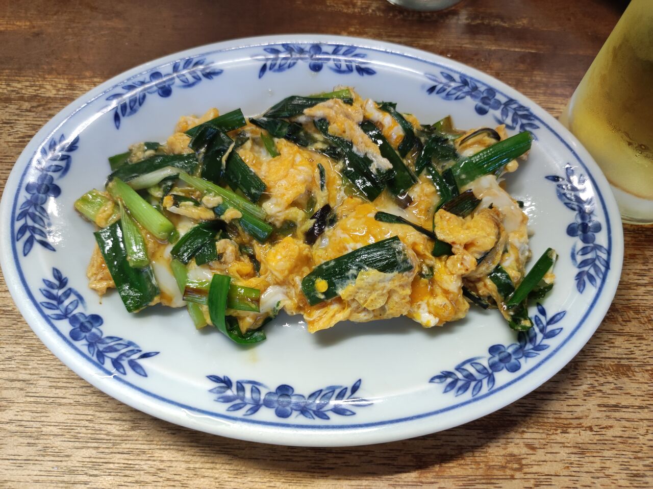 隣の男性2人はどうやら初めての来店らしく、生ビールを飲みながら壁に貼られたメニューを眺めている。そこに自分のニラ玉が届く。それを見て1人が「美味そー」と控えめな感想を声に出す。「うん、美味そうだね。」ともう1人が囁く。なんだか少し誇らしい。「そちらもニラ玉いかがですか?」と言いたくなる。・・・ニラ玉どころかニラを食べるのも超久しぶりだ。以前鐘ヶ淵の居酒屋で食べたニラ玉がとても美味しかったのを思い出す。一口・・・ほー、やや濃い味付けだが、これはハイボールに合うよなー。それにトロッとした卵が最高。墨田区、ニラ玉レベル高し!