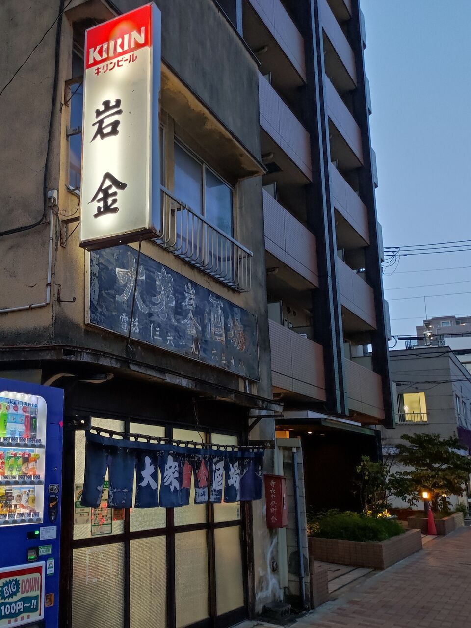 スカイツリーを背に、大きな通りを10分ほど歩く。すると、わー、この店に入りたい!この店で飲みたい!と思わせる、古びてはいるが貫禄十分の建物が見えてくる。ここ、ここ。ハイボール飲みたいよー。はやる気持ちを抑えて引き戸を開ける。「いらっしゃい!」・・・入口右手の壁沿いにテーブルが3つ。奥から2つは埋まっている。左手カウンターは入口に並行している短い辺が4席。若いご夫婦が座っている。奥に伸びる長い辺は7、8席。6人くらいが座っている。