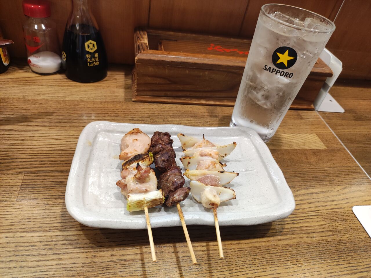 この辺で焼き鳥にいきますか。焼き鳥は「ねぎま、レバー、砂肝、皮、つくね、なん骨」それぞれ1本ずつ注文できるし、この6品盛り合わせというものある。それに加えて、絶品の手羽先(一皿2本500円)と獅子唐(160円)がある。・・・「すみません。ねぎま(160円)、レバー(160円)、なん骨(170円)を1本ずつ塩でお願いします。」と注文。今日はあくまで1時間の寄り道。おとなしくね。