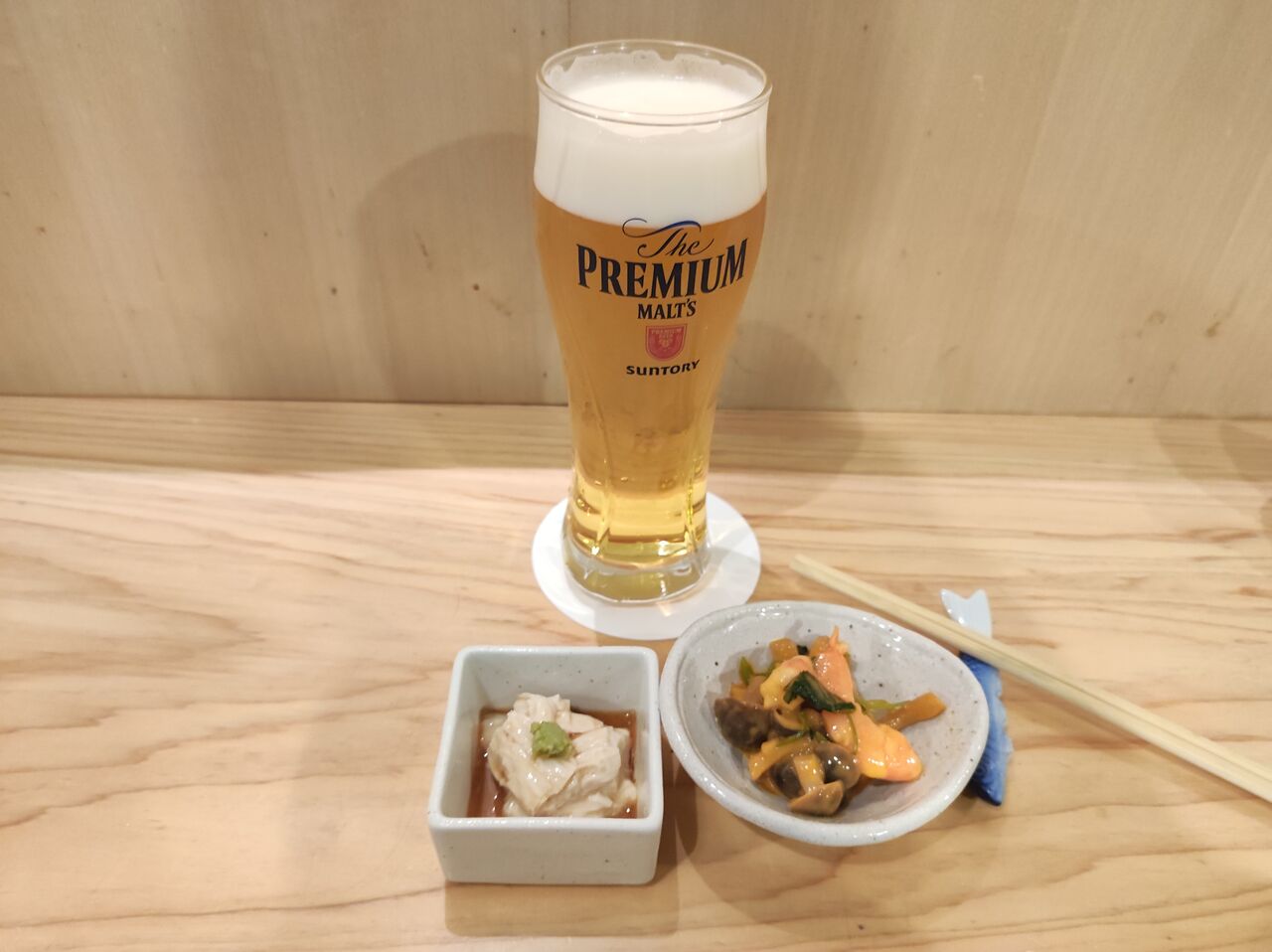 カウンターは5席。周りのカウンター席は全て埋まっている。カウンター奥にはサラリーマン2人組。手前のカウンター席の女性2人が丁度会計に立ち上がったところ。真ん中の席に案内される。女将さんが、改めて「いらっしゃいませ。ようこそ。」と言ってくれる。「生ビール(プレミアムモルツ500円)をお願いします。」と注文。「1人客は自分だけ」ということは寄り道飲みの宿命みたいなものだが、こんな時、お店の人の心遣いこそが最大の癒しだ。
