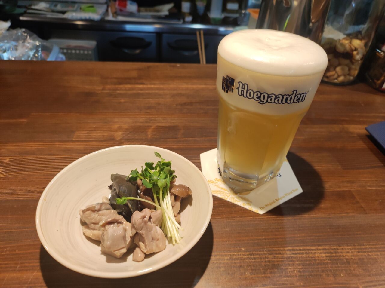 泡が落ち着くのを待ちながら、マスターが手早く「お通し」を用意してくれる。鶏肉と茄子、しめじを煮たものにカイワレが添えてある。うまそー。そこに、ビールが届く。泡の盛り上がりが見事だ。では、一口・・・本当にクリームみたいな泡、それがまず口の中にゆっくり入ってくる・・・そして・・・おお、この柑橘系を思わせる爽やかな香りと味わい・・・そして、すっきりとした甘みが口の中に広がる・・・うめー。特別な日の特別なビール。そんな気がしてきた。