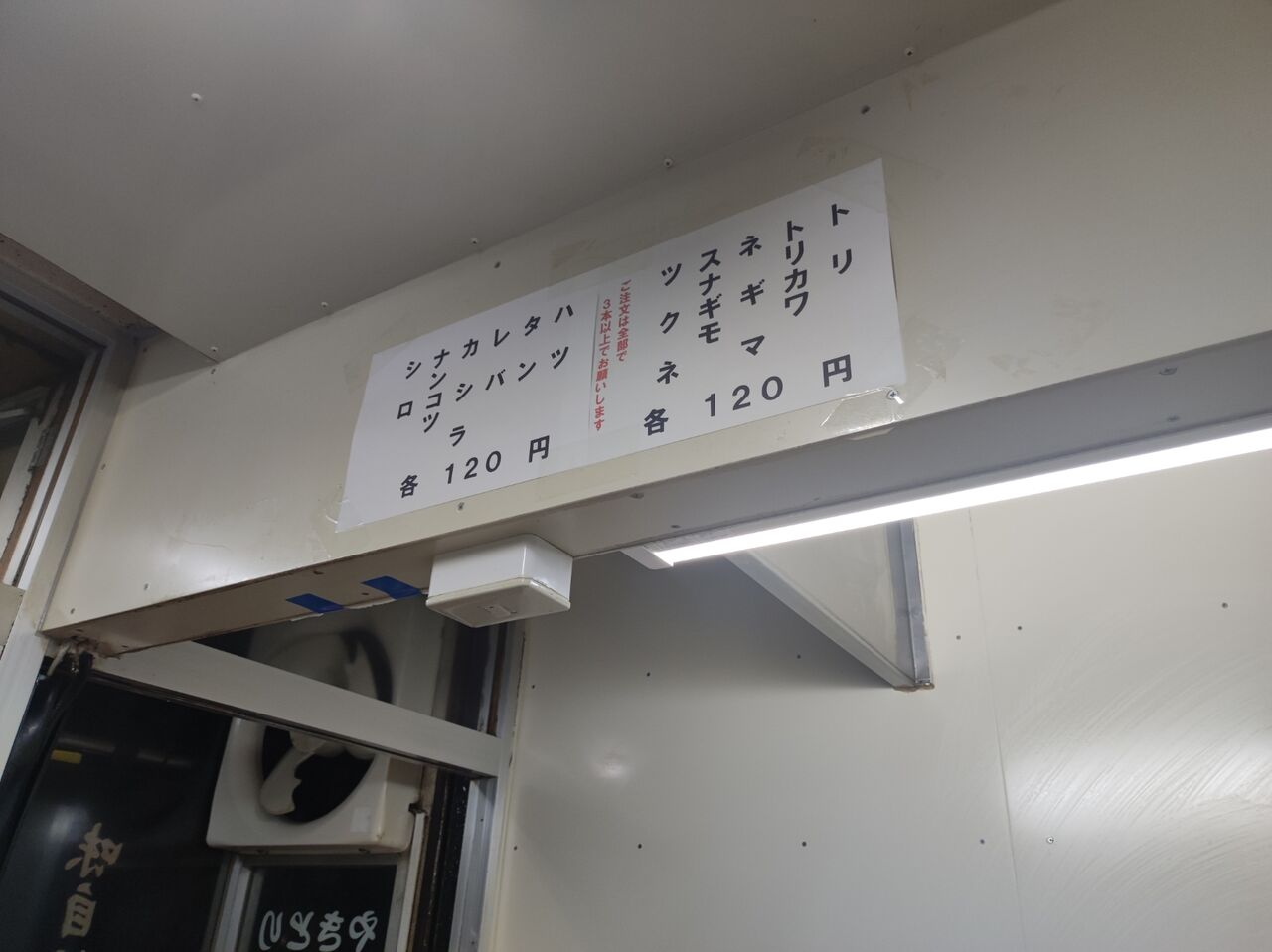 では、先日中野富士見町で食べ損ねた「もつ焼き」を注文しよう。焼き台のお姉さんに、「すみません。レバ、カシラ、ナンコツ、シロを塩で1本ずつ(1本120円)、それから、白レバー(1人前2本300円)をお願いします。」と注文する。テイクアウトで忙しそうではあるが、笑顔で注文を復唱してくれて、「少し、お待ちくださいね。」と言ってくれる。いい感じ。