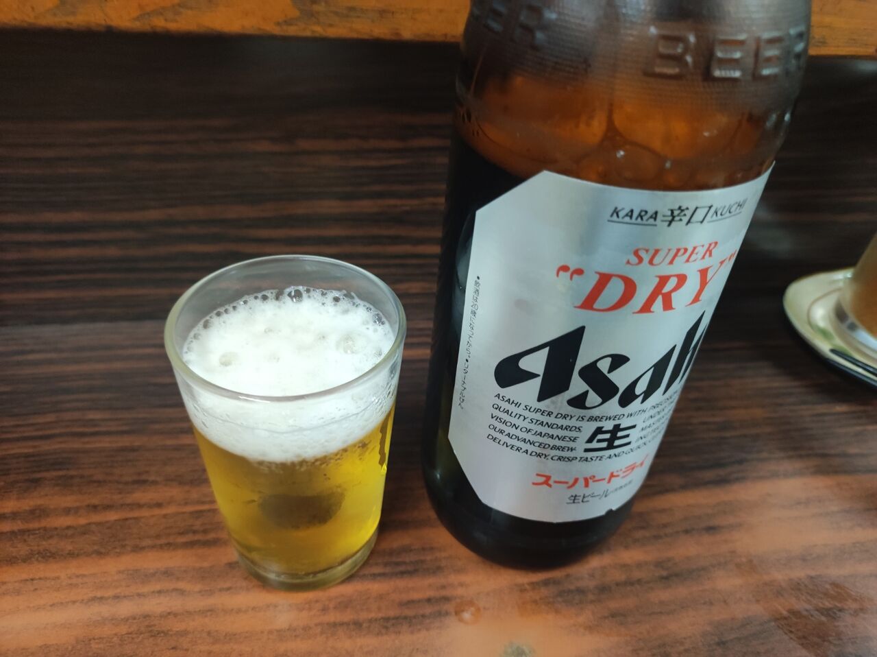 席に座る。「何にします?」とママさん。「瓶ビール(スパードライ大瓶720円)をお願いします。」と即座に注文する。鞄を後ろの冷蔵庫の上に置きながら、壁のドリンクメニューをチェックしていたのだ。なせか最初の注文を即座にすると、店の人の警戒心が溶けるような気がする。ママさんがマスターに注文を伝える。マスターがカウンターから出て、冷蔵庫に行きビール瓶を取り出して、ママさんに渡す。ママさんがグラスと共に届けてくれる。