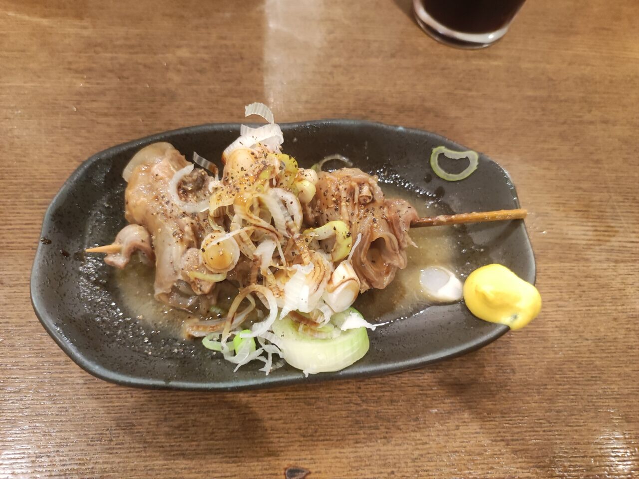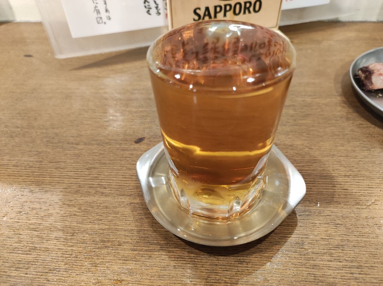 右隣の常連さんが「ナンコツ煮込み(170円)」を注文する。これもホワイトボードにあるメニューで、いつもあるわけではないとのこと。出てきたものを見ると・・・何これ!初めて見た。串に刺さったナンコツを煮込みの鍋で煮て、ねぎをかけたもの。絶対に美味いやつっていうたたずまい。「自分も、ナンコツ煮込みお願いします。」・・・いやー、楽しみだなー。「お待たせしました。」・・・来た、来た・・・一口・・・柔らかーい。それでいてコリコリも部分的に残っている。うめーなー、うめーなー。梅割り、梅割り・・・たまらん!