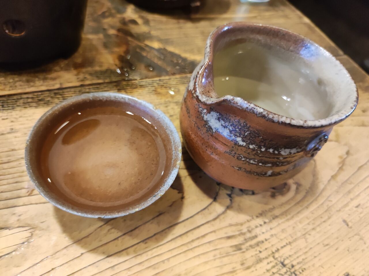 鍋には、キノコ類や豆類、根菜、葉野菜、油揚げなどいろいろな具が入っていて、飽きない。とにかく汁がいい味になっている。素晴らしい。ボリュームもあって、温まる。養生しているって感じだ。日本酒、もう一つ飲もうかな。気になっている酒を。「旭鳳の純米」広島市安佐北区の酒。実家に近いところの銘柄だ。「旭鳳(970円)をお願いします。」
