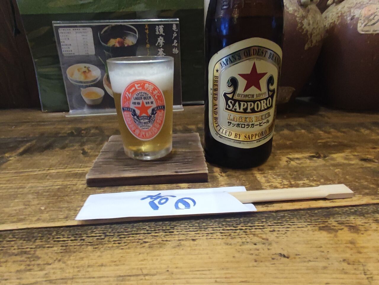 ビールは、生でしたらオリオンビール、瓶でしたらサッポロ赤星になりますが、どういたしましょう。」「瓶(中瓶750円)の方でお願いします。」と注文する。店は静かで、民芸調の落ち着いた作りがいい。すっかり心が落ち着いて、のんびり過ごしていると、ビールが届く。木のコースターがまたいい感じ。グラスに注いで、一口・・・ああ、美味い。今年もよく頑張った・・・のかどうかは分からないが、無事終えることができた。この店での時間は、自分へのご褒美だな。