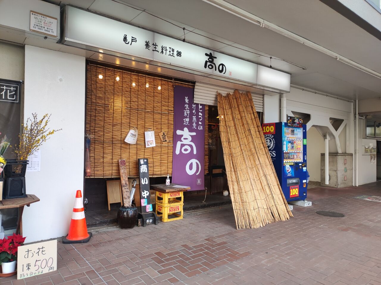 公園が見えたら、その左手の集合住宅の建物に向かう。一階部分が店舗になっている。その中に簾を立てかけた店が見える。おお、ここだ。「商い中」の板が目に入ってくる。少々、入りづらい雰囲気を醸し出してはいるが、どうやら営業中なのは間違いなさそうだ。やっと入れるぞ。紫の暖簾には「養生料理 高の」と白く染め抜かれている。