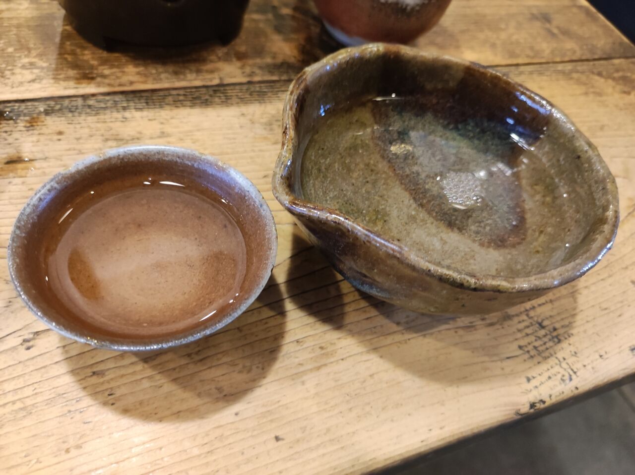 4種のお通しを楽しみながらビールを飲み終える。次はどうしよう。日本酒が充実しているようなので、おすすめの日本酒メニューを眺める。田酒や豊盃という青森の名酒がまず目にとまる。それから目を移していくと・・・佐賀の酒がある。佐賀の日本酒は美味しいからなー。銘柄は「栄光菊(無濾過生原酒)」・・・これにしよう。ママさんに「栄光菊(970円)をお願いします。」と注文する。冷蔵庫から一升瓶が取り出される。片口に移され、盃と共に届けられる。「どうぞ。」・・・ふえー。いい感じ。
