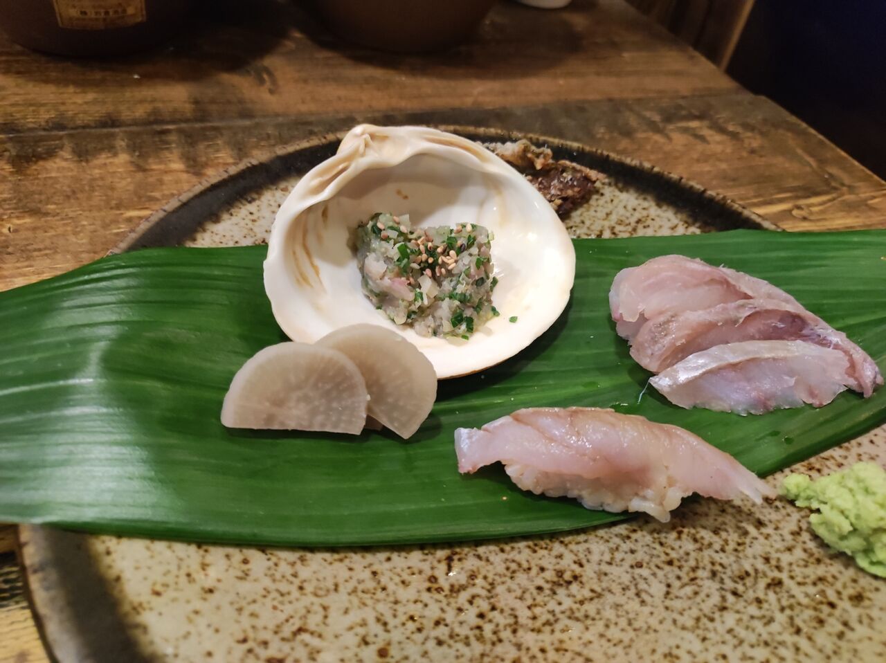 鍋を食べながら待っていると、ママさんが、大きな皿を届けてくれる。なめろう?握り寿司、刺身もついている。美味しそうだ。なめろうを一口・・・んめー、味が濃い。こんな美味しいなめろうは初めてかな。刺身も一口・・・もちもちした食感。これまたいい味。じゃあ、握り寿司を・・・素晴らしい!美味しいなあー。