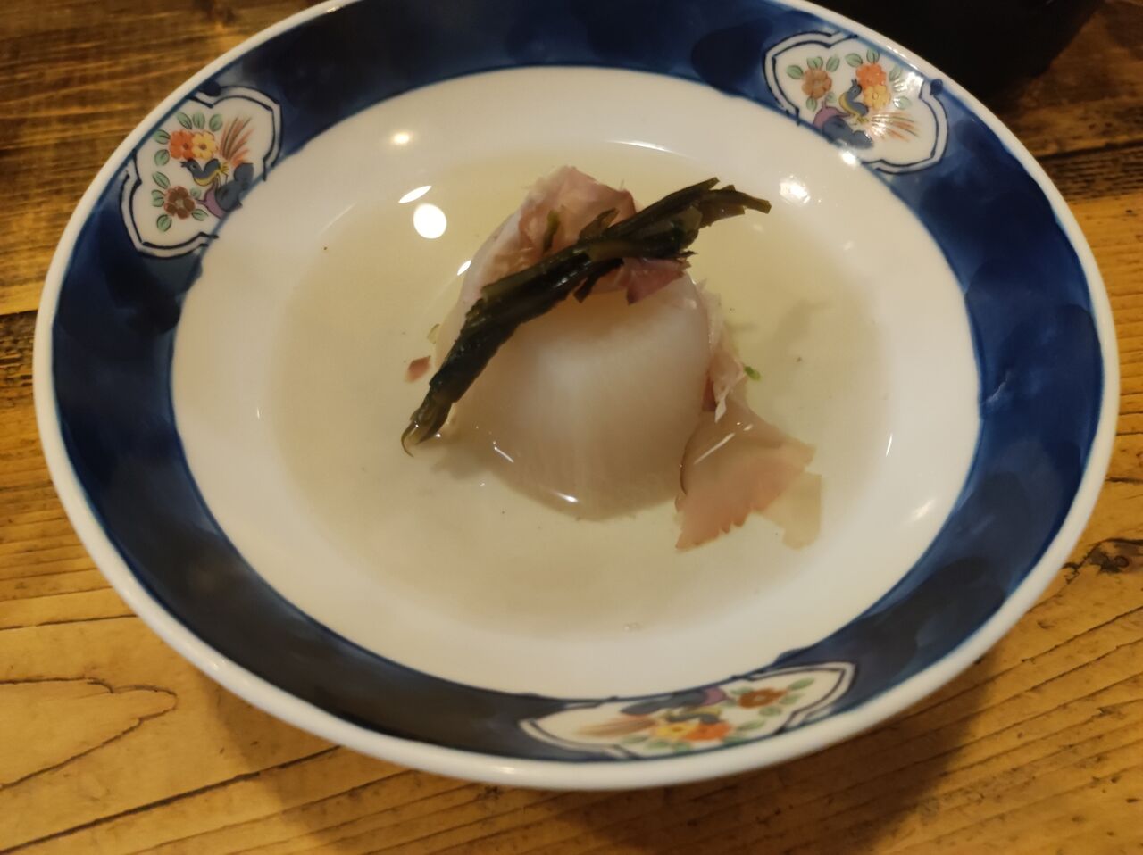 では、一口・・・なんと!フルーティー!甘みを感じると同時に、それが爽やかなのだ。よく冷やされているのも味を引き出しているんだな。んめー・・・マスターがカウンターの中の厨房から出てきて、「今日はご来店ありがとうございます。お礼の気持ちです。風呂吹き大根をお出ししますので、召し上がってください。」・・・えー。「風呂吹き大根、大好きです。いただきます。」・・・一口・・・透き通って優しい出汁に、ほっくりと煮えた大根がまた味が沁みて・・・美味しいなー。気持ちも嬉しい。