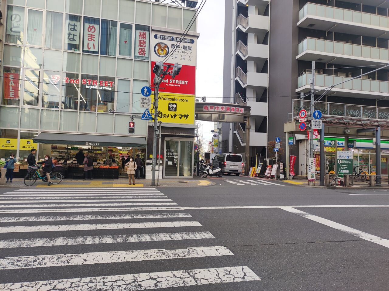 電車は秋葉原駅に到着。時間は午後1時32分。いい感じだ。秋葉原駅から乗客は一気に増える。電車は隅田川を渡って「両国」に向かう。例によってスカイツリーが現れる。錦糸町・・・そして亀戸駅に到着。改札を出るともう見慣れた風景。今日はロータリー右手から小路に入り、飲食店街を通っていく。ん!「亀戸ぎょうざ」に行列ができていない。うー、入りたい。でも、今日の目的はここではない。自分に言い聞かせてさらに歩く、亀戸中央商店街に出たところで左に曲がり、大通りへ。斜め道向かいに「すき家」を見ながら横断歩道を渡り、後は真っ直ぐ西に向かって歩く。