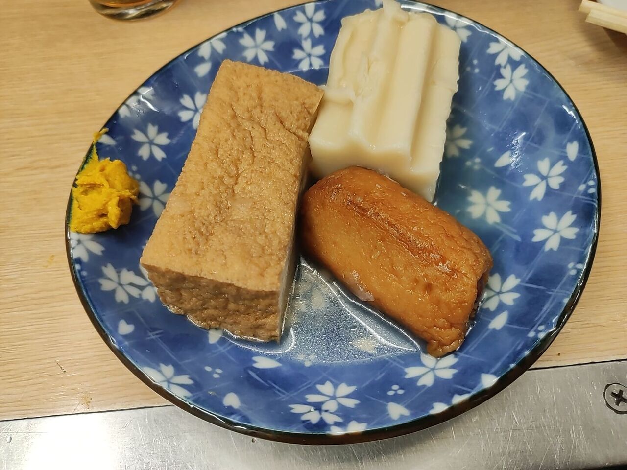 年配の男性客が入ってきて、少し迷って、自分のすぐ左の席に座る。入り口すぐに移動したお客さんが右の席に鞄を置いていて、その右側が空席、その右が自分だったのだ。そのお客さんは瓶ビールを注文し、すぐにおでんも注文する。自分の目の前におでん鍋があり、気になっていた。それから立て続けに麻婆豆腐を追加注文している。迷いがない。相当の常連さんと思われる。自分もおでんが食べたくなり、目の前の店員さんに「おでん、いいですか。」と問いかける。「どうぞ。」「じゃあ、ウィンナー巻き、ちくわぶ、厚揚げ(各120円)をお願いします。」「はい。3品ですね。」