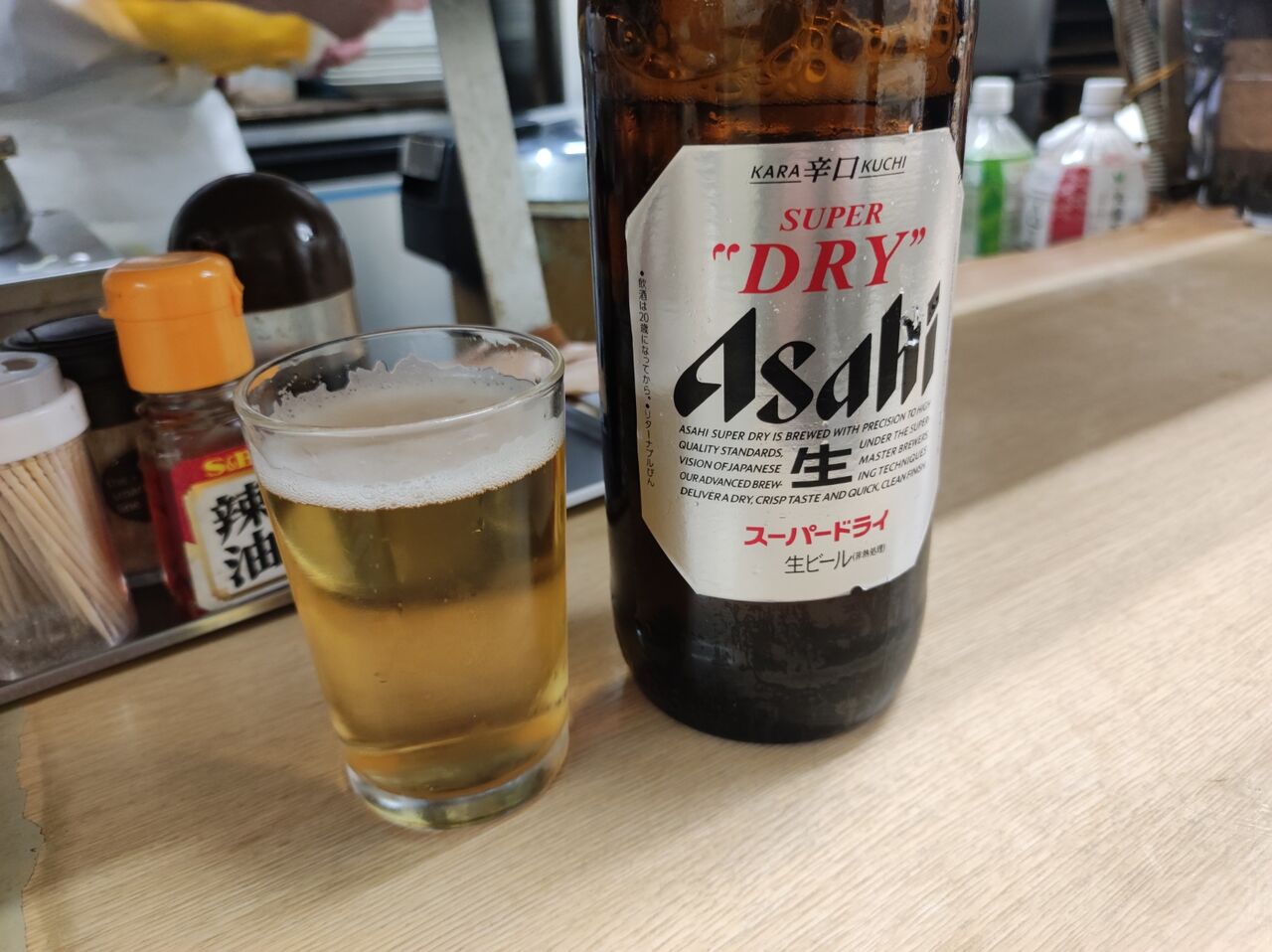 戸を開けて店の中に入る。入るとすぐに立ち食い蕎麦のカウンターがある。そこを通り過ぎると、奥に長い12席くらいのカウンターが続く。通路を挟んで壁際に5席ほどのサブカウンターがある。お客さんは8人くらい。カウンターの真ん中あたりが空いている。その辺りに大きなネタケースが取り付けてあるので、カウンンターの中にいる店員さんに注文しづらいからだと思われる。それは鶯谷店で経験したことから分かること。ただし、その時と違うのはネタケースの下のスペースが縦に広くて、ビール瓶を立てたままで通るくらいだということ。鶯谷の時はビールを80度くらい傾けないといけないくらいだったから。