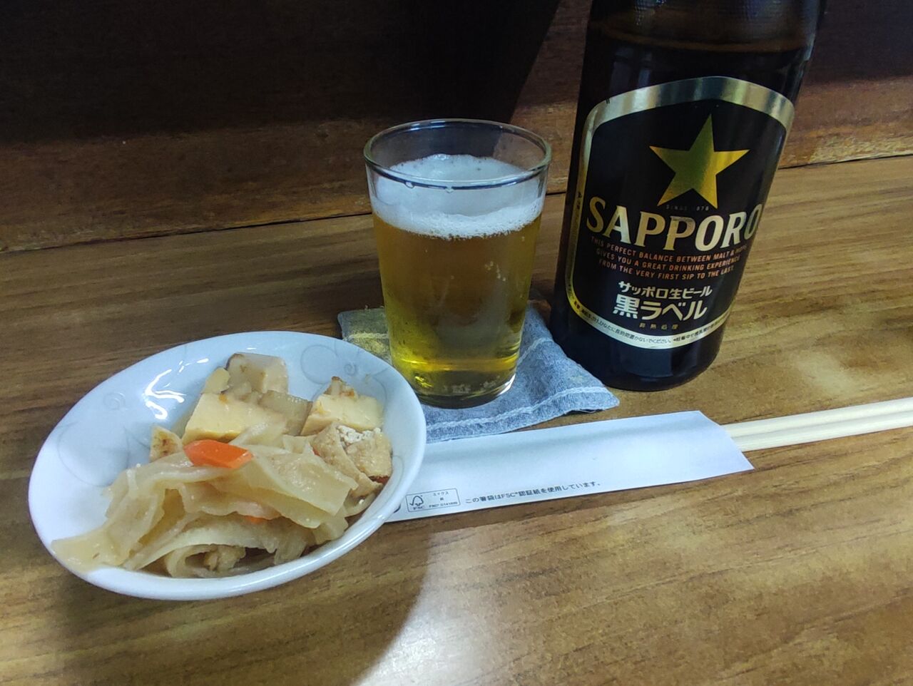 ビールとグラス、そしてお通し(筍と干し大根の煮物400円)が届く。「では、どうぞ。」とママさんがビールを注いでくれる。お酌してもらうの久しぶりだなあ。「ありがとうございます。」では、一口・・・いろいろ迷ってここに来たけど、正解だったようだな・・・よく冷えたビールが喉に心地よく流れて行く。うめー。では、お通しを、美味しそうな煮物だなあ。筍を一口・・・柔らかく煮てある・・・よく味が沁みている・・・出汁が効いていて美味しいなあ。ビール、ビール。