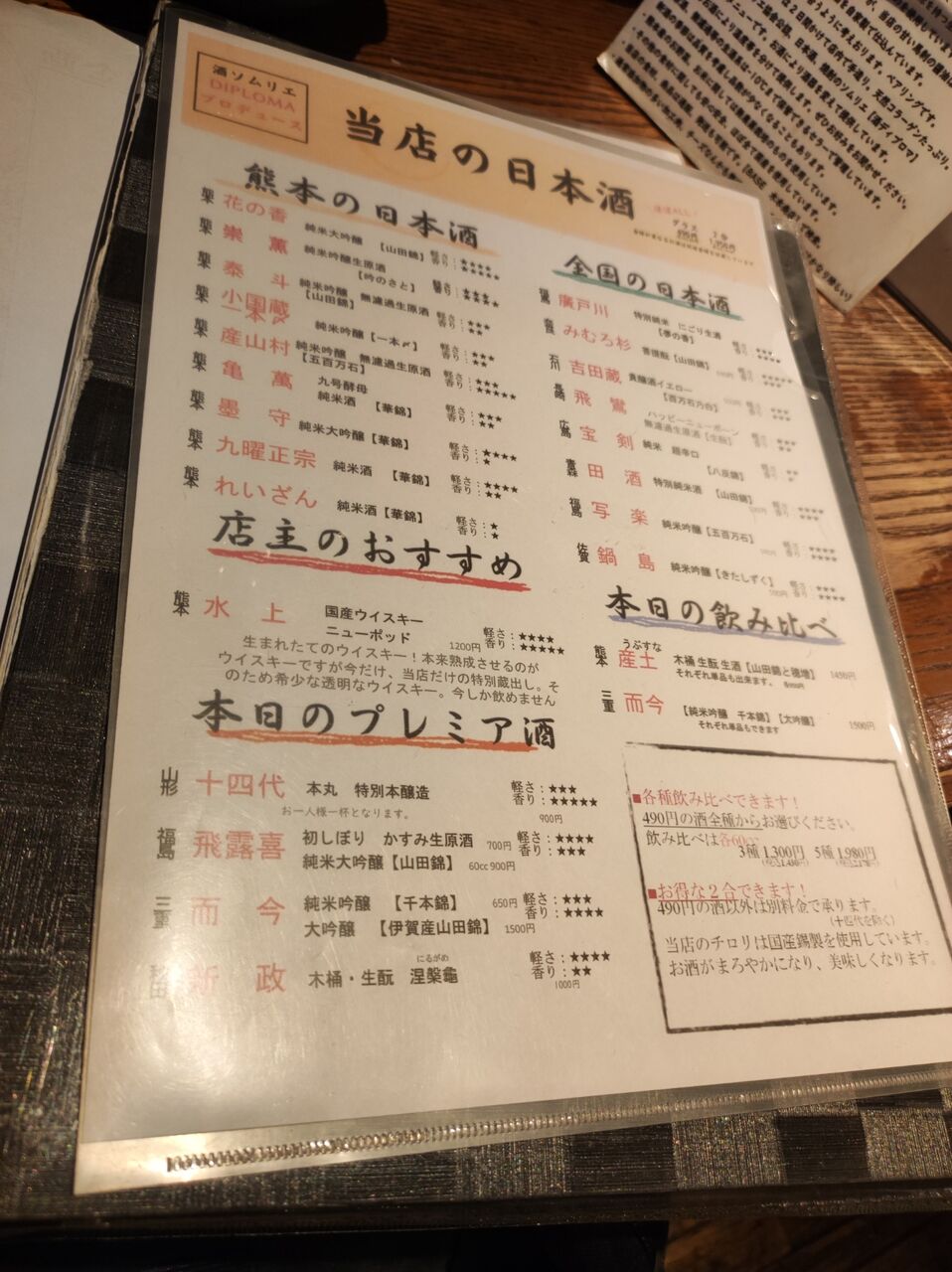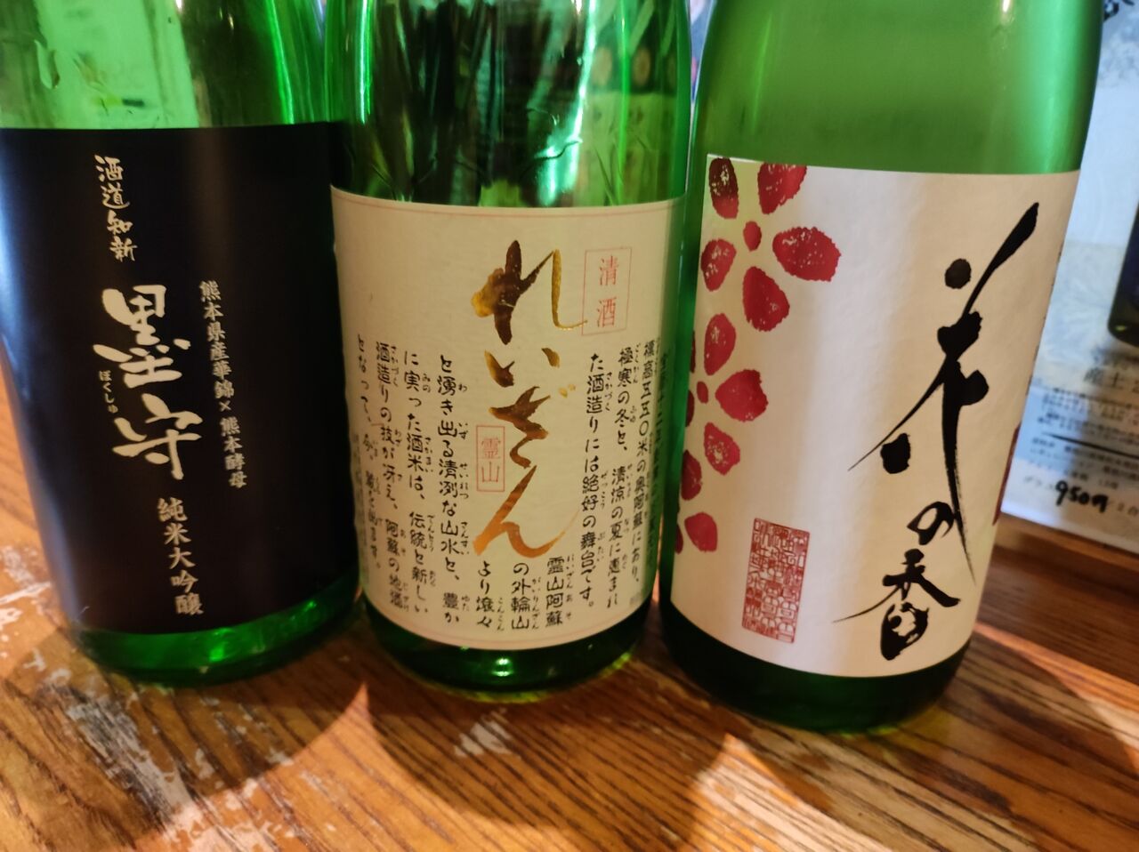 それにしても店内に並んでいる酒瓶の種類の多さには圧倒される。熊本の酒はもちろんなのだが、全国の酒が揃っている。日本酒、本格焼酎・・・飲んでみたいものばかりだ。メニューをめくっていると、「飲み比べ3種」というのがある。熊本の銘柄を中心に3種選ぶことができるようだ。広島の「宝剣」もその中にある。へえー。これにしよう。「すみません。3種飲み比べ(1300円)をお願いします。」「銘柄はどうなさいます。」「んー。やっぱり熊本の酒で。まず、墨守、それから、れいざん、あと・・・、ん・・・花の香を。」と注文する。