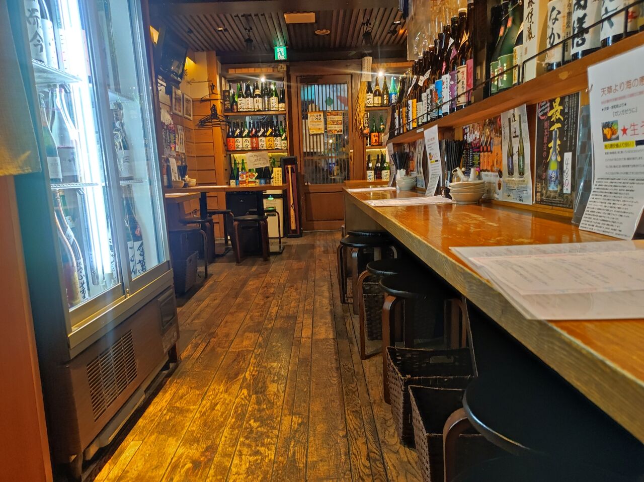 迷わずドアを引いて、店の中に入る。すぐに若いお姉さんが出てきて、「いらっしゃいませ。」と、とても控えめな声で迎えてくれる。「あの・・・、1人なんですけど、大丈ですか?」と問う。なぜならば、お客さんが1人もいなかったので、もしかしたら今夜は貸切の予約が入っているのかもしれないと思ったからだ。「お一人ですね。カウンター席にどうぞ。」という答えにホッとする。店は手前にテーブル席が3つ。その奥にカウンターが10席ほど。さらに奥に個室もあるようだ。テーブル席を抜けて、カウンターのさらに奥から2番目の席に座る。