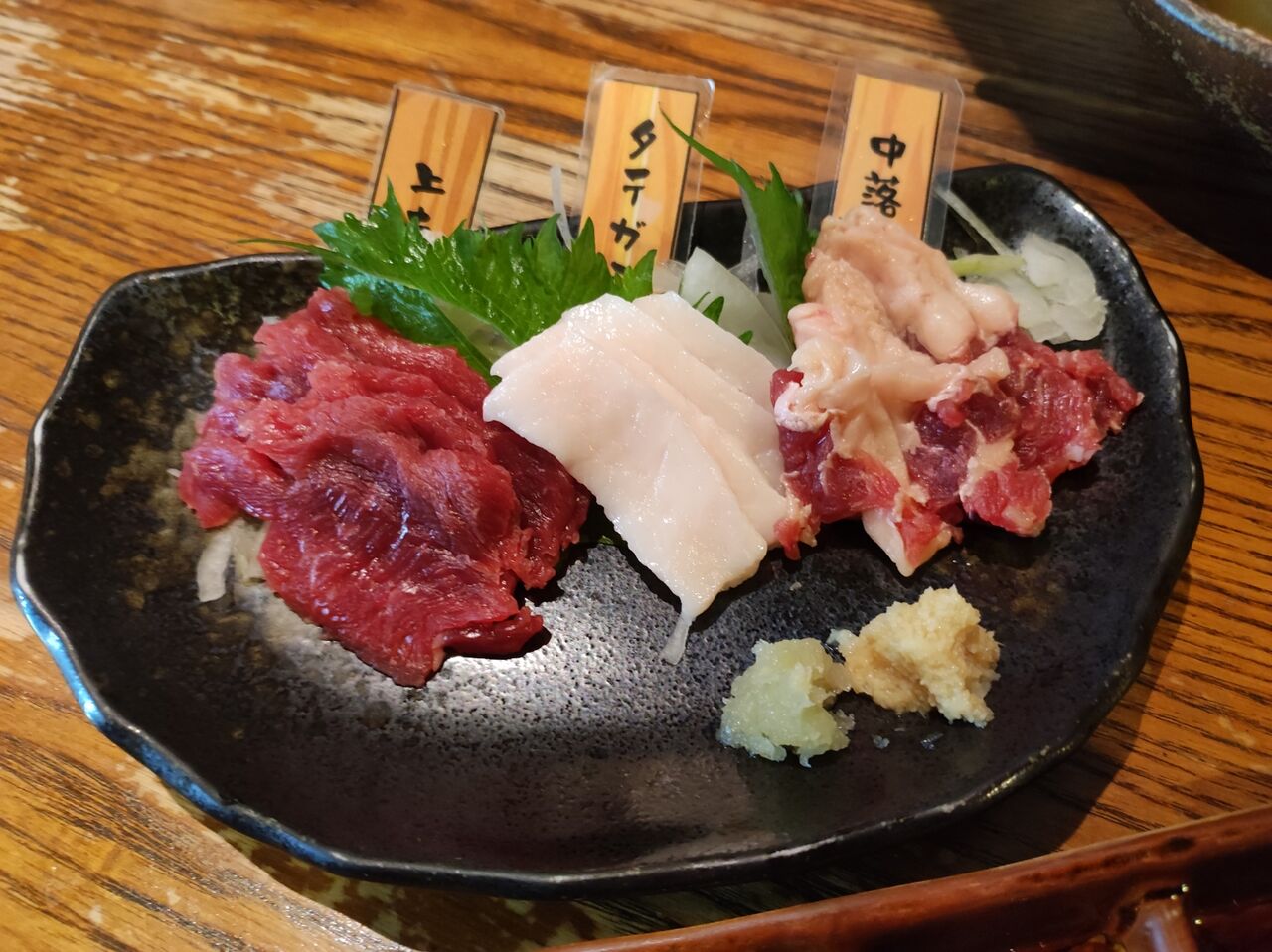 「馬刺し3種盛り合わせ」が届く。まず、醤油ざらは3つに分かれているが、入っているのは2つ。「醤油は同じものです。お好みで生姜かニンニクでお召し上がりください。」とお姉さんが静かな声で説明してくれる。3種にはそれぞれ札がついていて、上赤身、タテガミ、中落ちと書いてある。じゃあ、順番に・・・上赤身から、一口・・・雑味なし・・・肉の旨みのみ・・・ニンニクと甘い醤油に抜群によく合う。美味しい!次はタテガミ。白い脂?一口・・・とろける・・・生姜にも合うな・・・これはクセになる美味さ。中落ちを一口・・・コリっとした歯応えもある。噛むと旨味が溢れる。馬刺しって美味しいんだな。ビール、ビール。