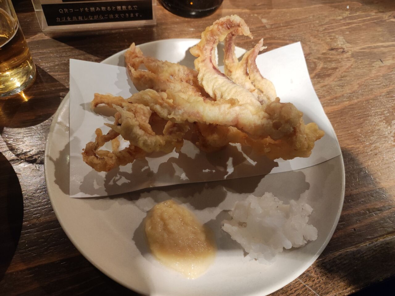 スマホで読み取り、ログインしてメニューを注文する。まずは瓶ビール、つまみは「おすすめ」の「ハムキャ別」と「揚げ物」の中から「ゲソの天ぷら」を選ぶ。カウンターの中には男性店員さんが、飲み物を作ったり、厨房から上がって来る料理を各テーブルに運んで行ったりと忙しく働いている。目の前にいるので、口頭で注文してもいいのだが、邪魔をしないようにスマホですべて注文を済すことにする。