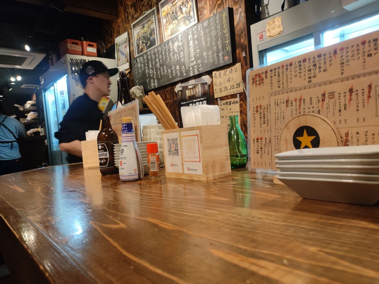 開け放されたドアから中に入る。学生アルバイトらしい男性店員が出てきて、「お1人様ですか?」と問う。「はい。」と答えると、「ご案内します。」と店内の立ち飲み合みスペースに連れて行ってくれる。L字型のカウンター席その周りに立ち飲みテーブル。フロアを取り仕切っている、髭が特徴の店員さんが「カウンターの空いているところへどうぞ。手前か、真ん中か。お好きな方へ。」「じゃあ真ん中にしますね。」と言って、中に入る。右隣は女性の1人客。左隣は40代の男性1人客。鞄をカウンター下の棚に入れていると、自分の前にQRコードが印刷されたプレートが置かれる。