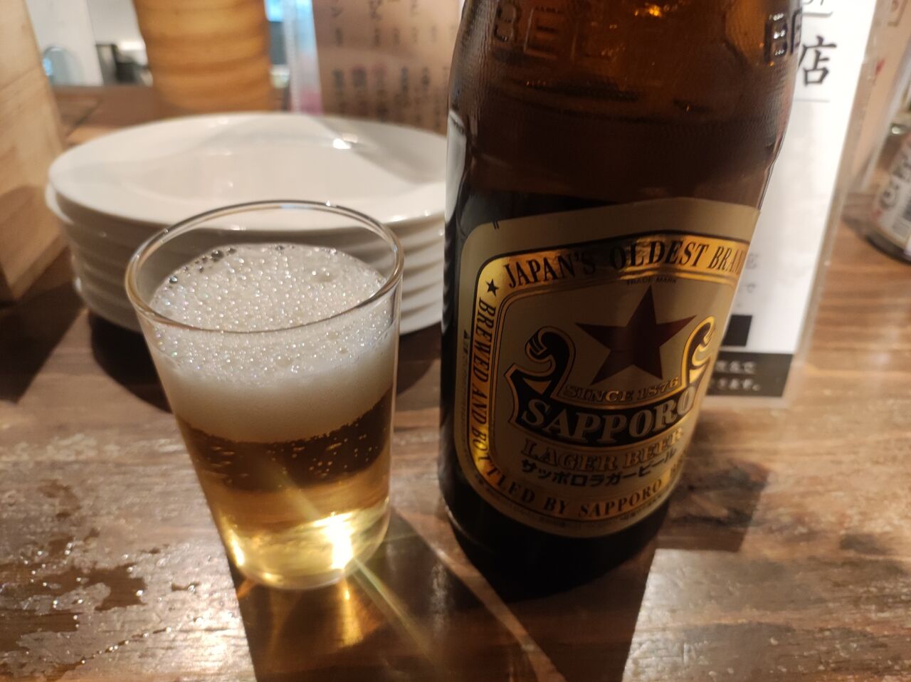 ほどなく瓶ビール(サッポロラガー中瓶490円)が届く。さて、まずは一口・・・今日も気温高めだったし、この冷たさと、柔らかい苦み・・・うめー。移転前の店は大きなカウンターがメインだったけど、今の店はカウンターよりもテーブル席の方が多いので、グループで来ている客が多い。女性ばかりのグループも目立つ。年齢層は30代から40代の人が多い印象。ネットなどで調べて来た人も多くなったようだ。