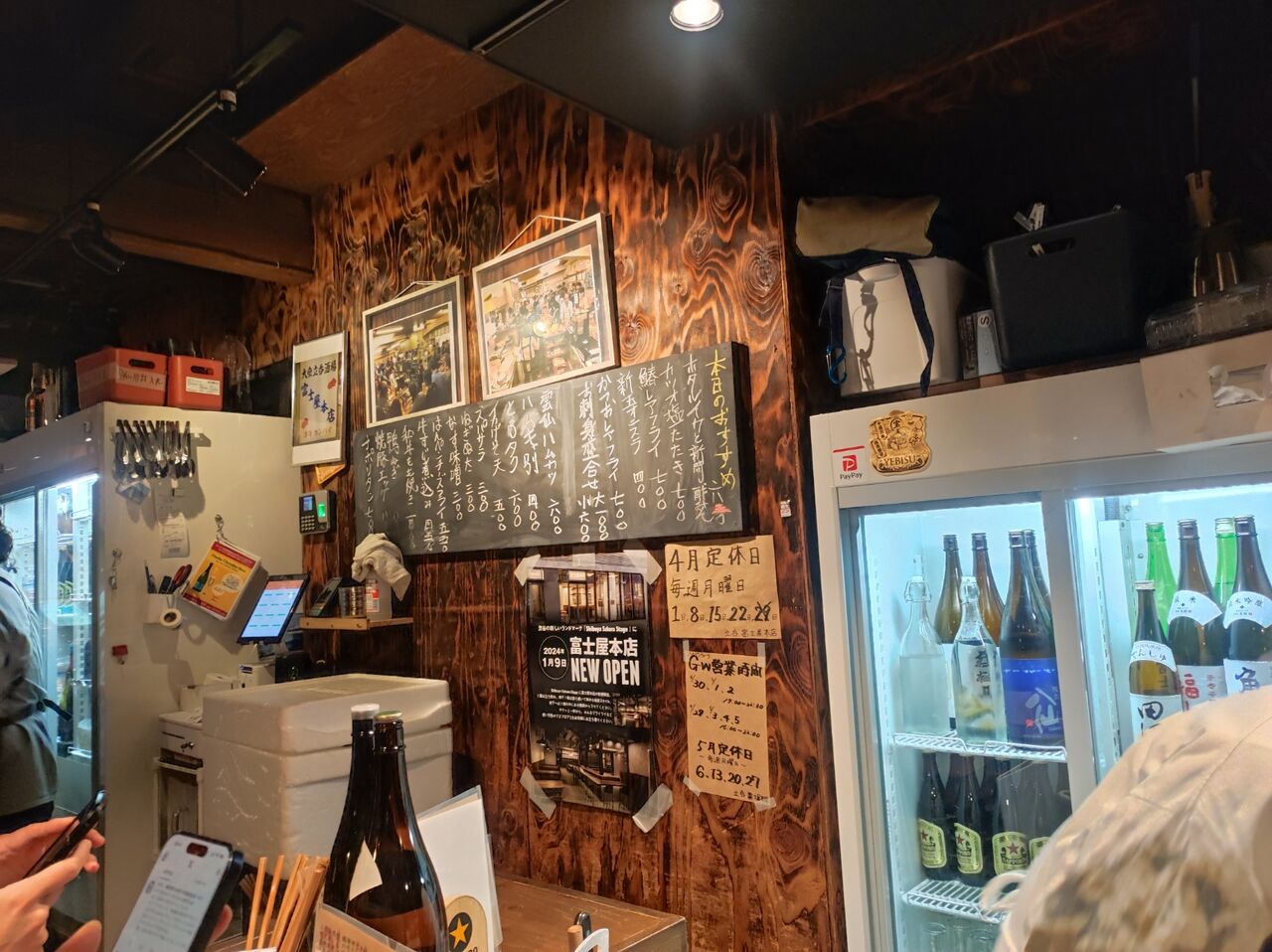 午後6時過ぎ。東急東横線で渋谷駅到着。渋谷スクランブルスクエアのエスカレーターを上り地上へ出る。JR渋谷駅構内に入り、西口を目指す。金曜日の夜、もちろん尋常ではない人混み。例によって、外国人の「クレイジー!」という驚きの声が聞こえる。バスロータリーの横断歩道を渡り、渋谷フクラスのエスカレーターを2階へ。そして直結している桜が丘の歩道橋を渡る。歩道橋を降りて、桜が丘の坂を登る。すると、レトロな雰囲気の建物があり、外の立ち飲みテーブルでは多くのグループが盛り上がっている様子。手前には電光看板。そこには「富士屋本店」と書かれている。