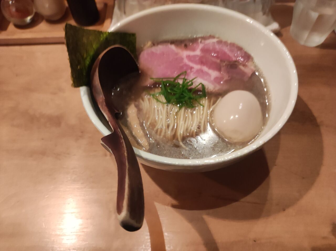 店に入ると、L字型のカウンター。「いらっしゃいませ。奥の席にどうぞ。」とカウンターの中にいた2人の店員さんが声を掛けてくれる。横棒の一番奥の席が空いているのでそこに向かう。「ご注文は?」「味玉そば(1100円)をお願いします。」と注文して、カウンターの上の棚に置いてある小皿に千円札一枚と百円硬貨を一つ置く。