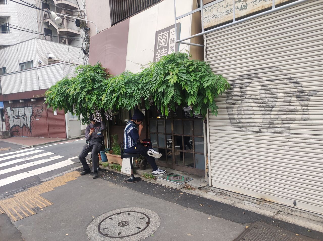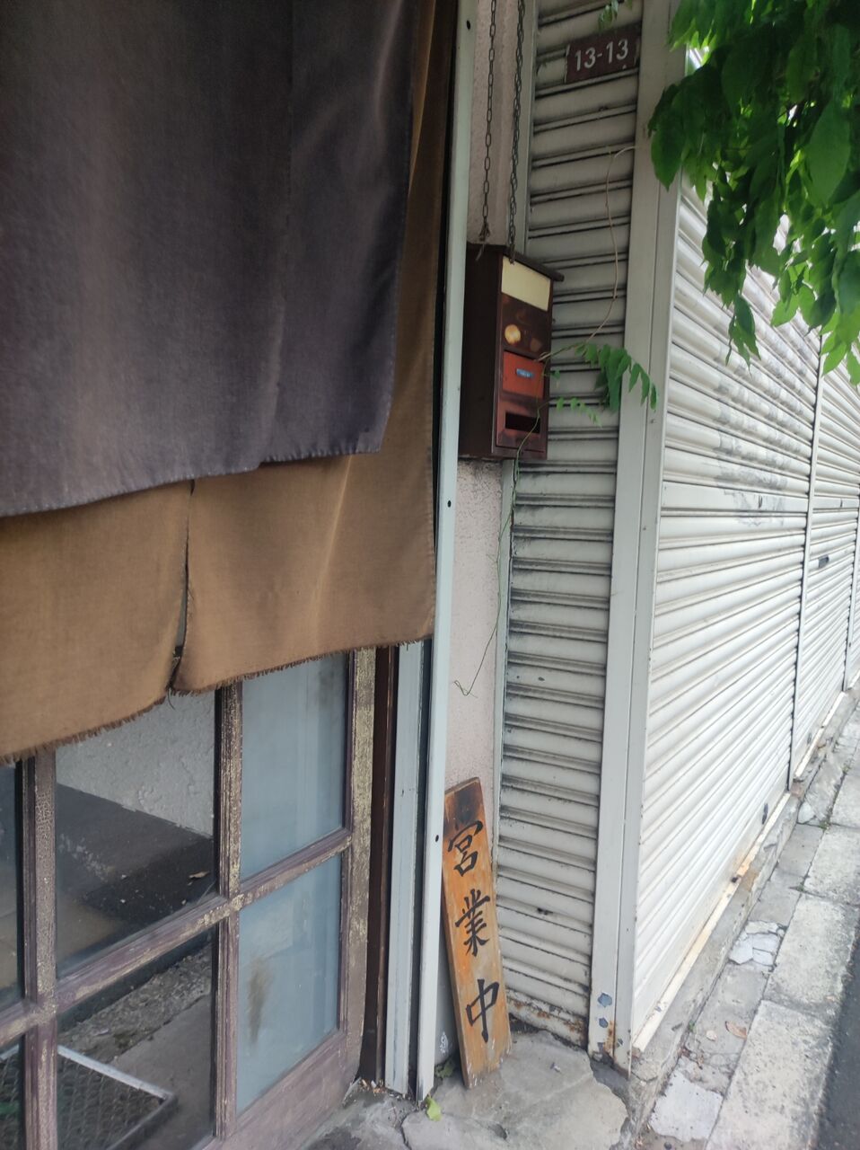 2つ目の信号を渡ったところにそれらしい店が見える。古びた建物と屋根のところに蔓みたいな植物の葉が繁っているのが印象的。店の前に男性が二人。その道向かいに女性2人組と男性2人組が並んでいる。全部で6人。先頭と2番目は店の前の椅子に座っている。自分は7人目。そこにすぐにスーツ姿の男性が自分の横に立つ。さらに、いかにも評判を聞いて探して来たという感じの年配の男性が列に並ぶ。店内は6席ということなので、ちょっと残念。12時に開店。前の6人が店の中に入って行く。店員さんが自分に「お1人ですか?」と問う。「1人です。」と答えると、「どなたかが出てきたら、すぐに入ってこられて大丈夫です。」「わかりました。」「では、その椅子に座ってお待ちください。」